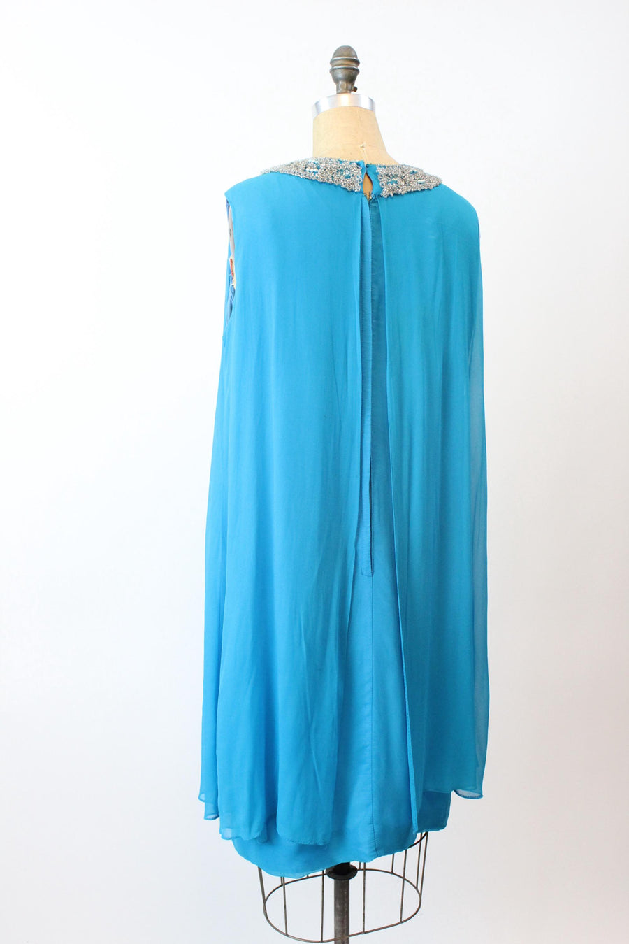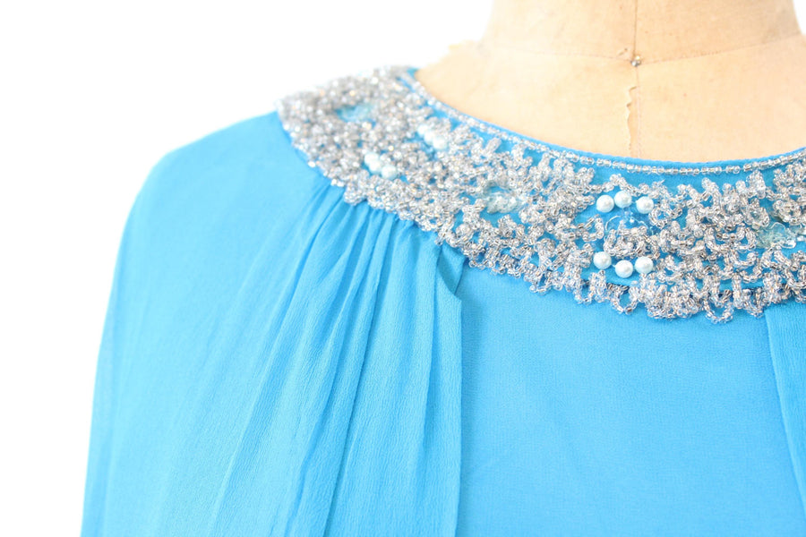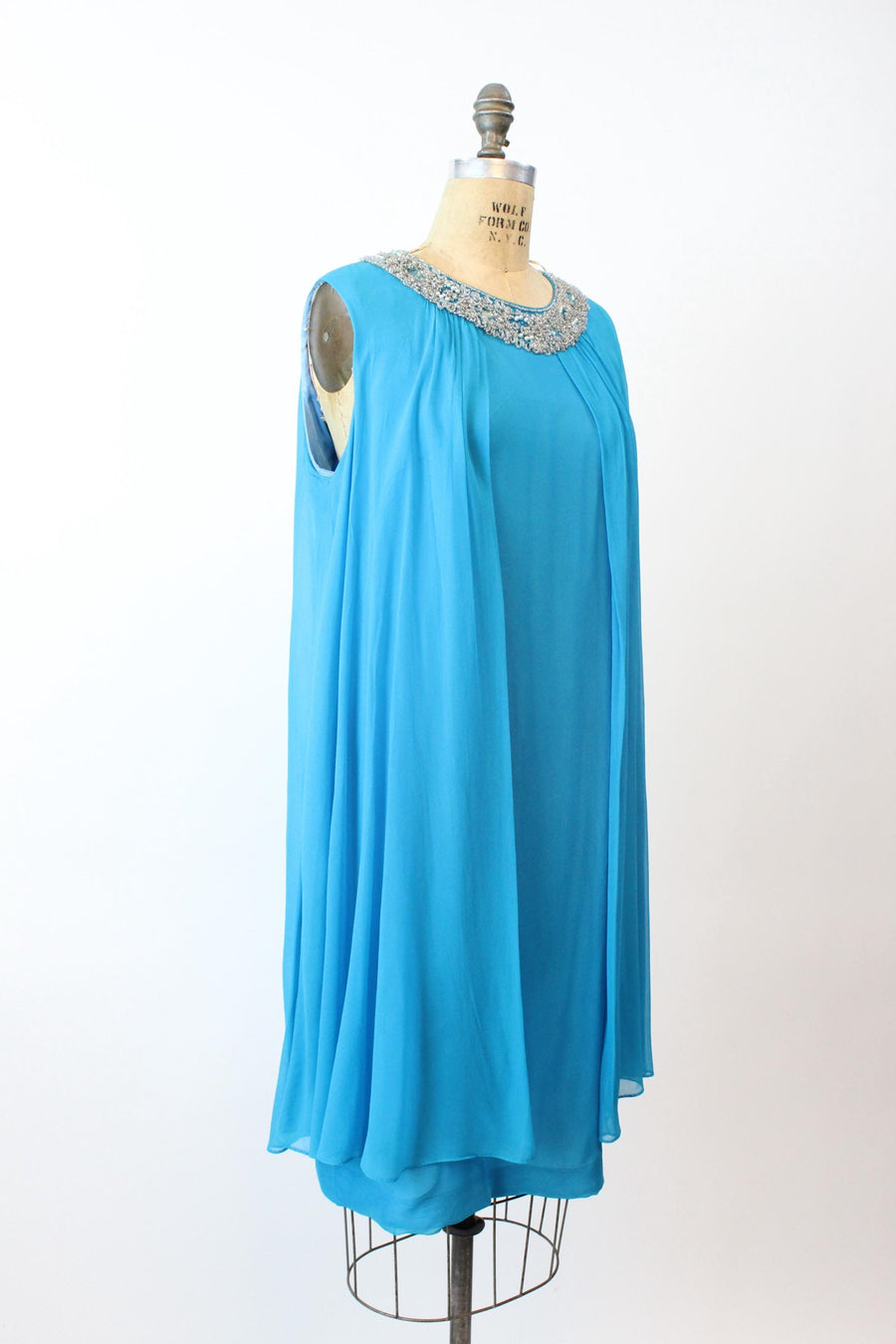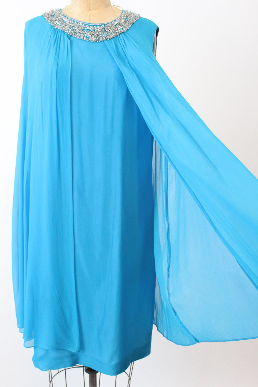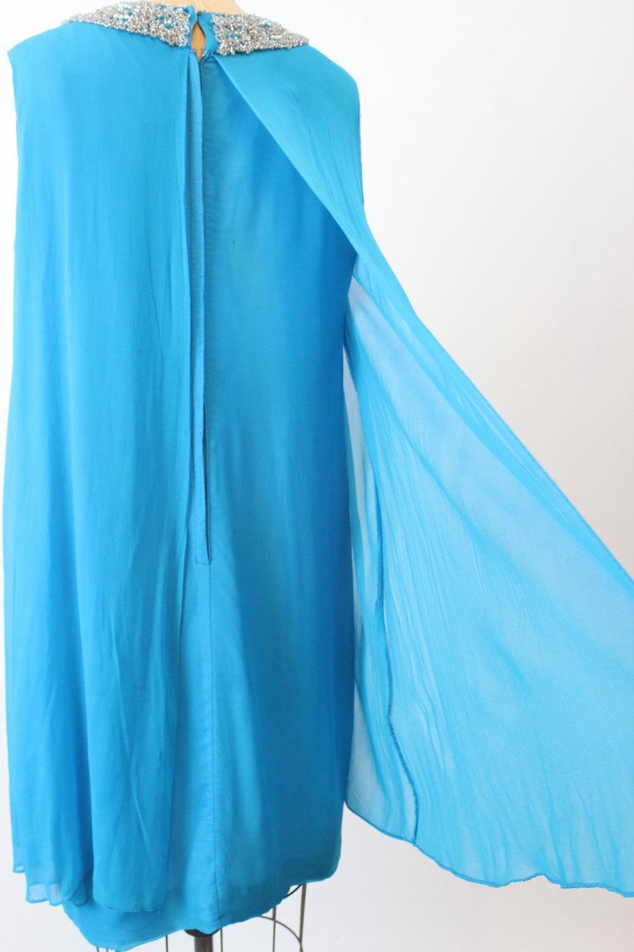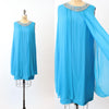 Chic 1960's cocktail frock! Done in a bright blue silk chiffon. Inner sheath dress has a loose cape dress that floats over the top. Neckline is adorned with beads and sequins. Back metal zipper. Fully lined.