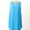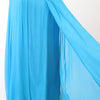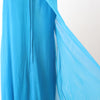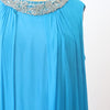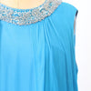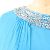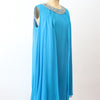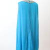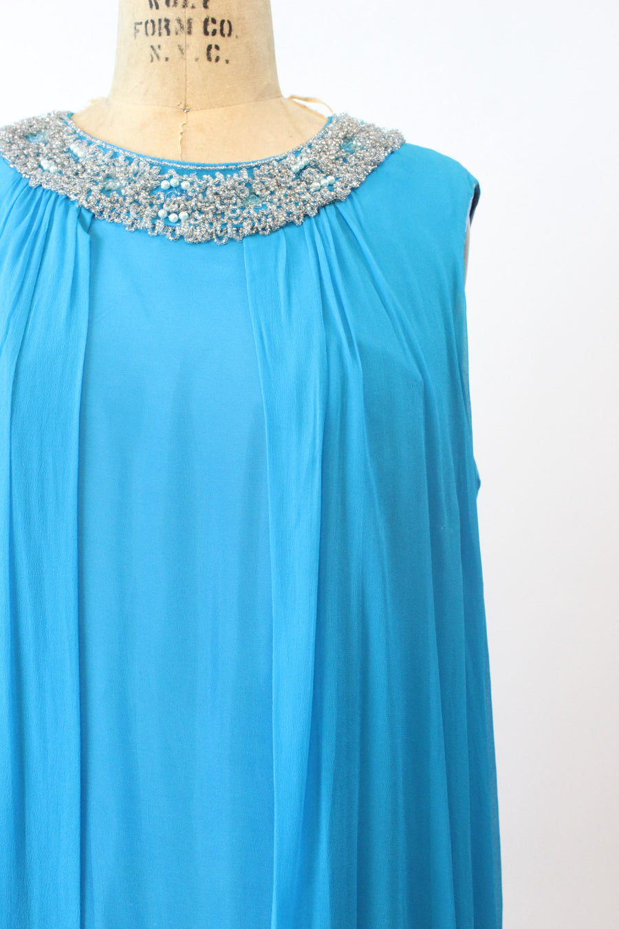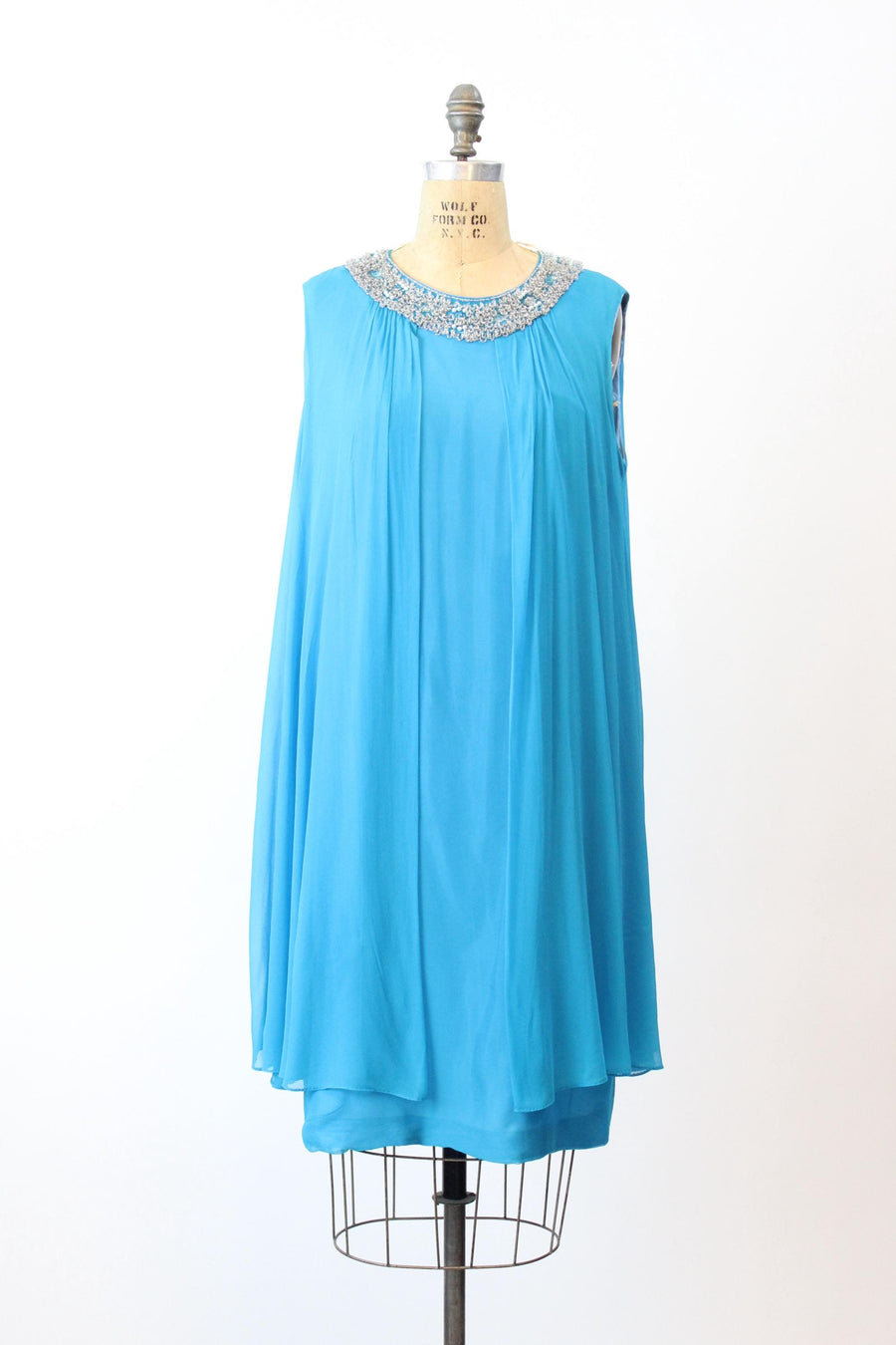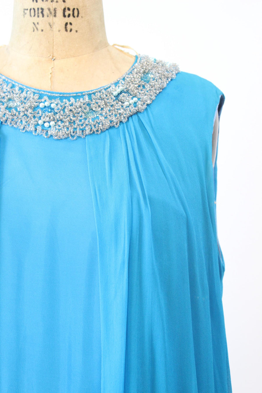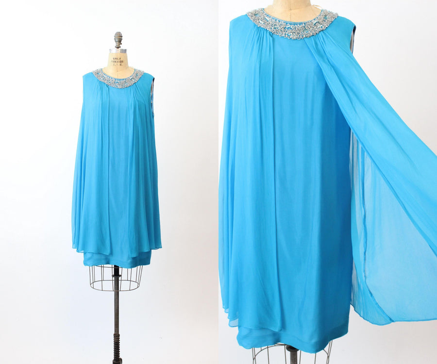 Chic 1960's cocktail frock! Done in a bright blue silk chiffon. Inner sheath dress has a loose cape dress that floats over the top. Neckline is adorned with beads and sequins. Back metal zipper. Fully lined.