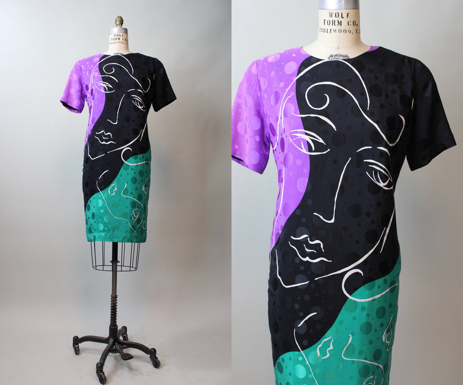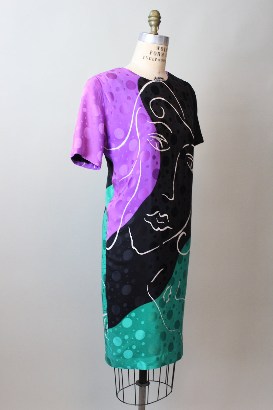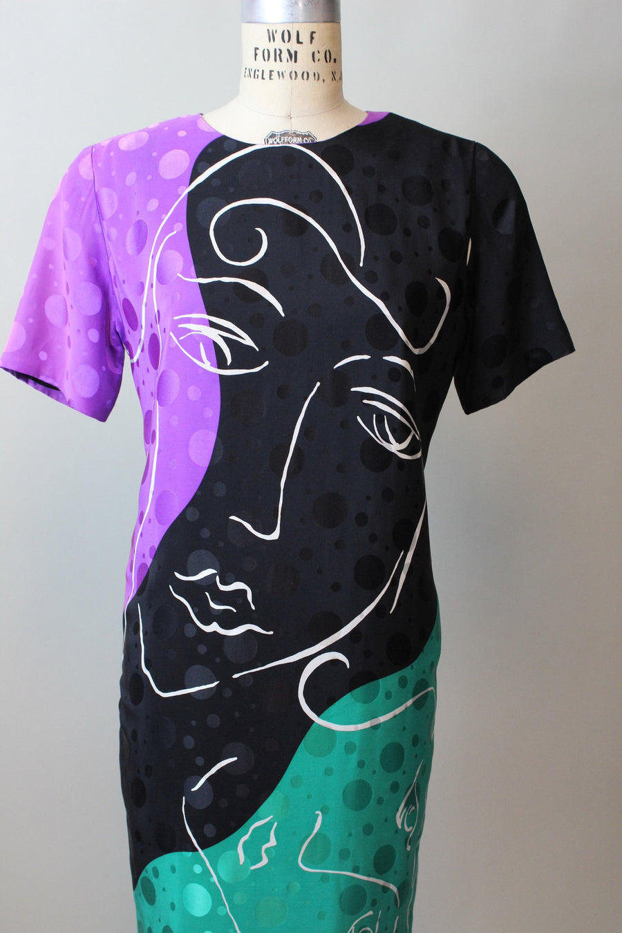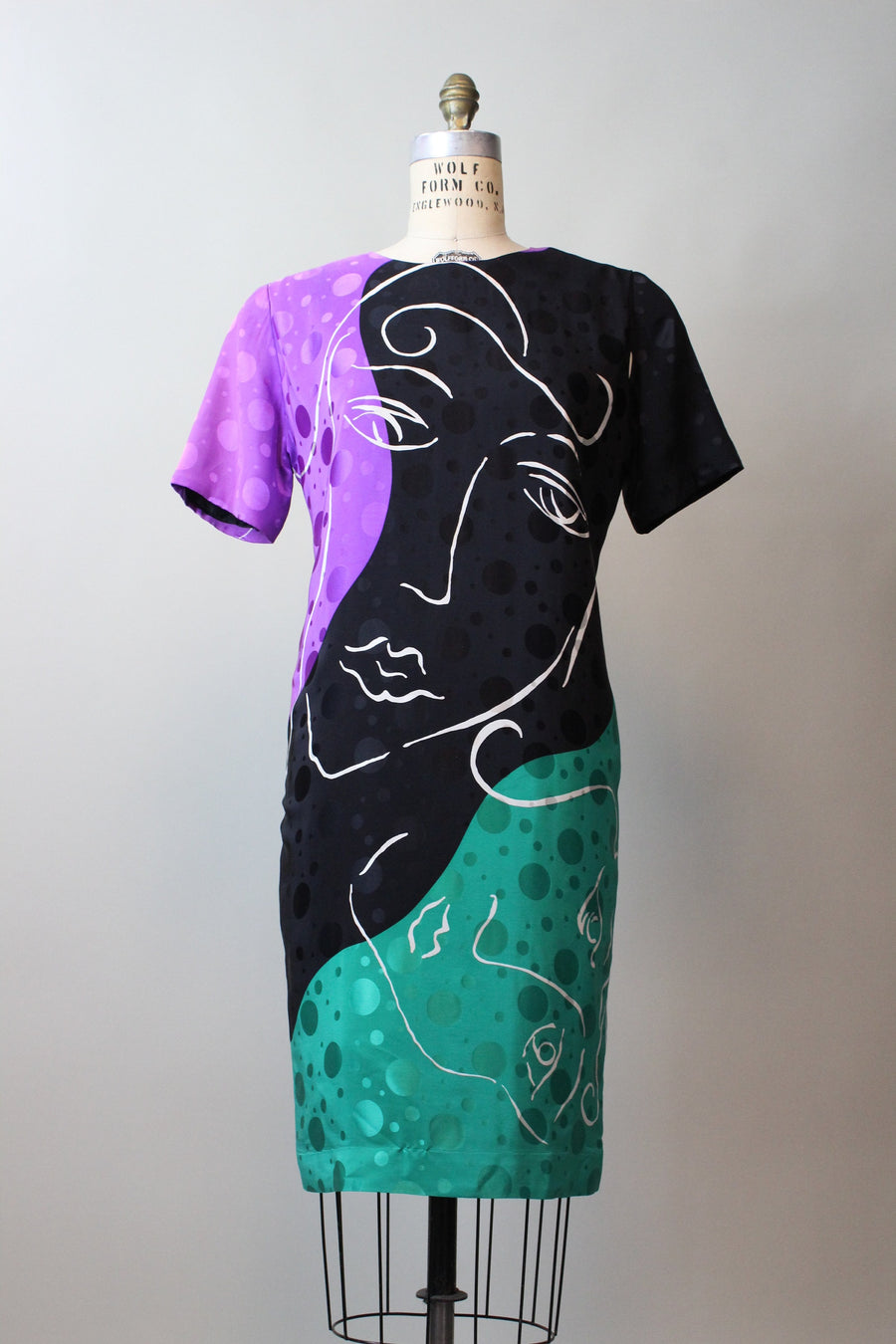 Chic silk drss with HUGE sketched womens faces on a jacquard polka dot silk. Shift style with broad shoulders and narrow hem. Shoulder pads. Back zipper. Fully lined.