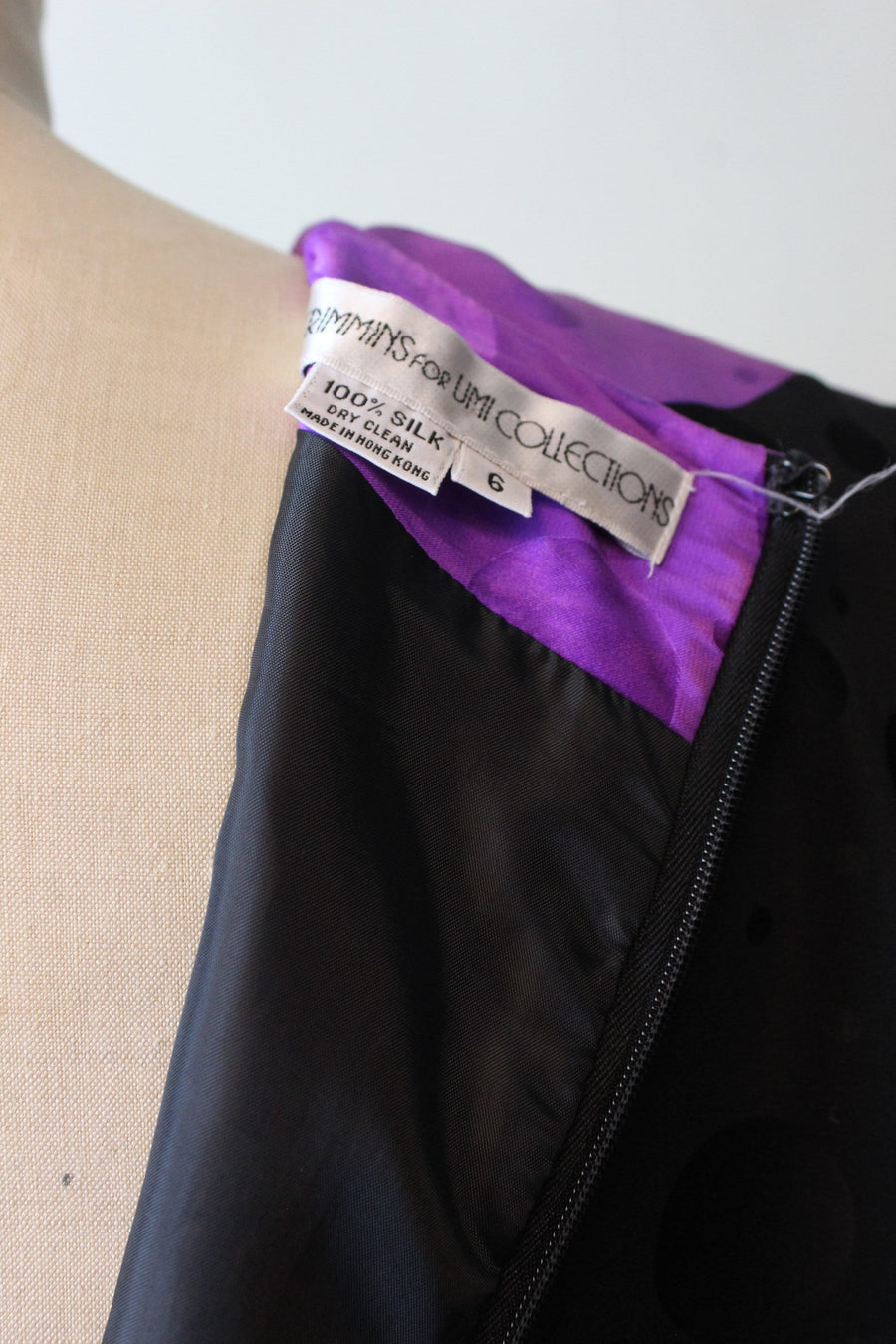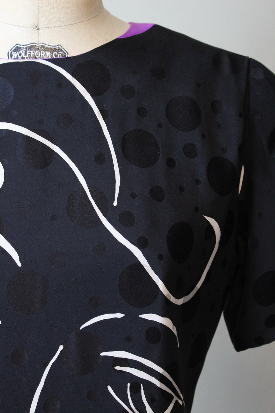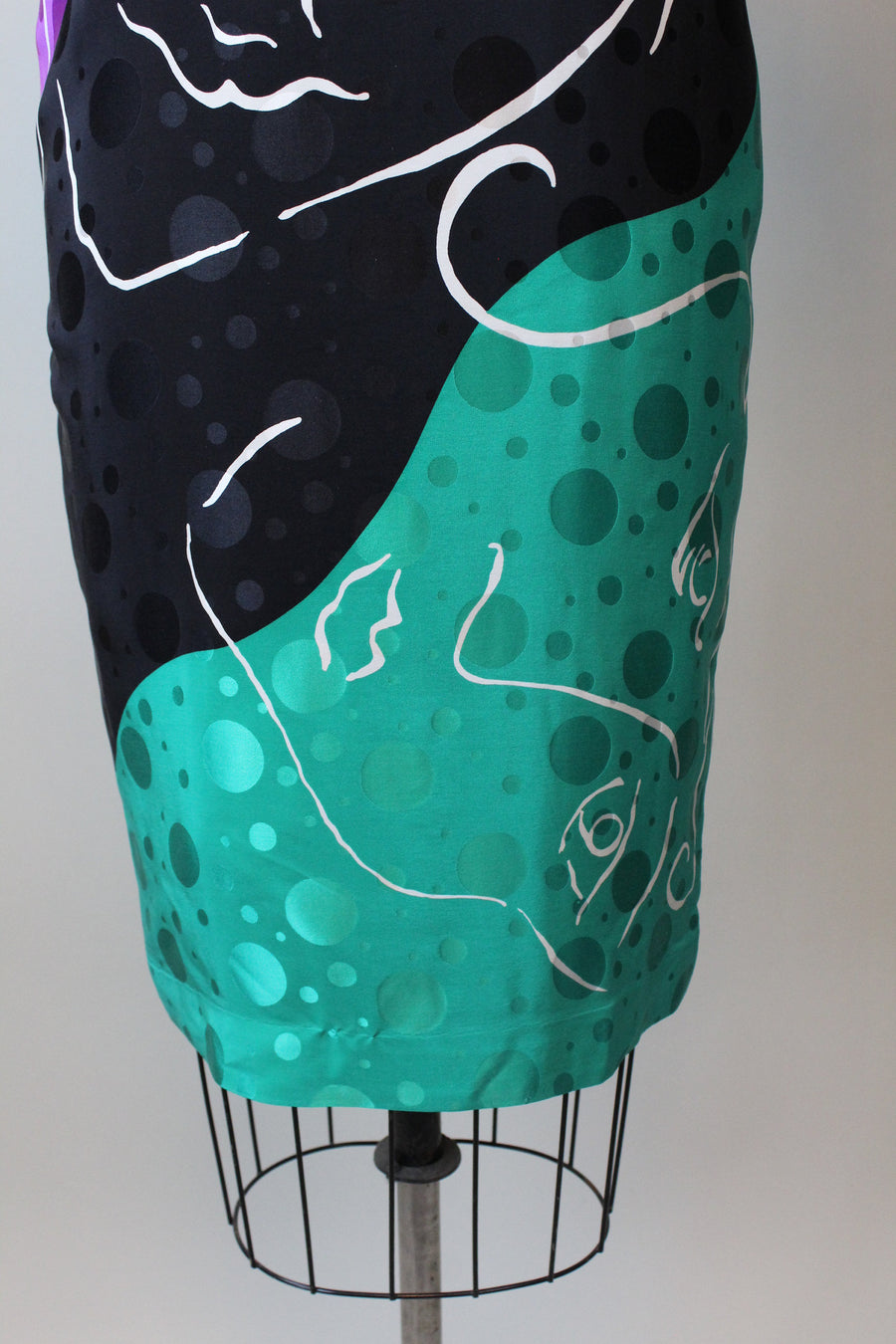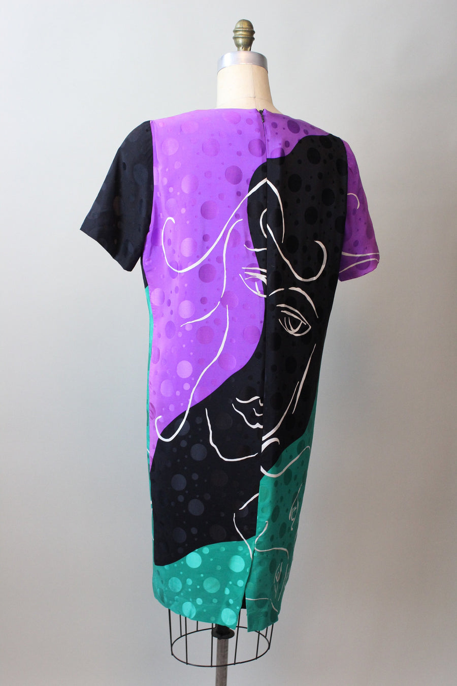 Chic silk drss with HUGE sketched womens faces on a jacquard polka dot silk. Shift style with broad shoulders and narrow hem. Shoulder pads. Back zipper. Fully lined.