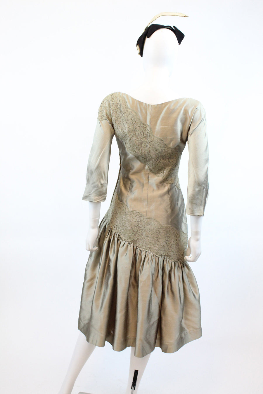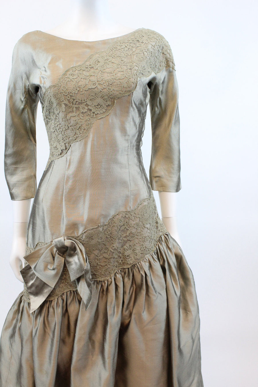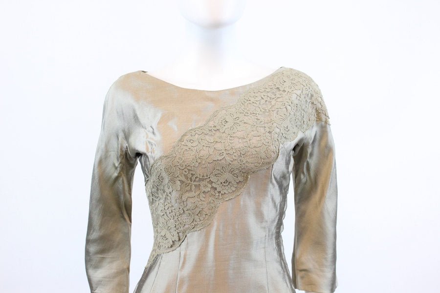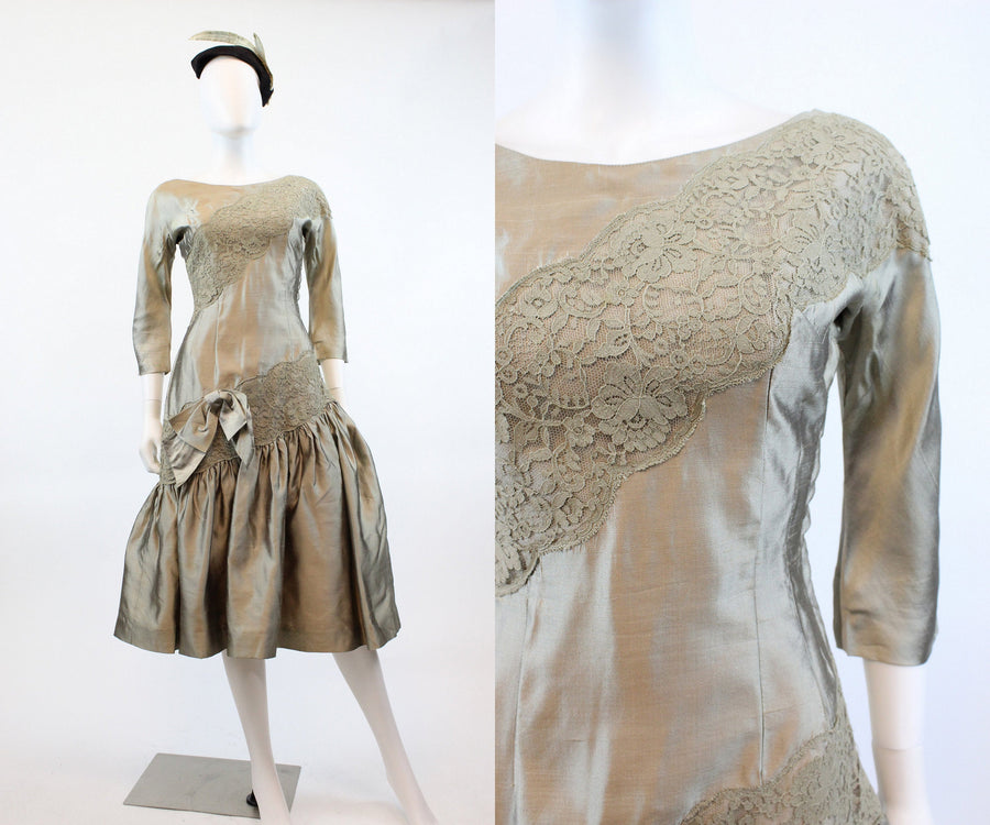 Stunning 1950's tulle confection! Done in a shimmery mushroom color silk and lace. Asymmetrical style with angled slashes of lace. Gathered full flirty flamenco skirt with attached bow. Side metal zip. Fully lined.
