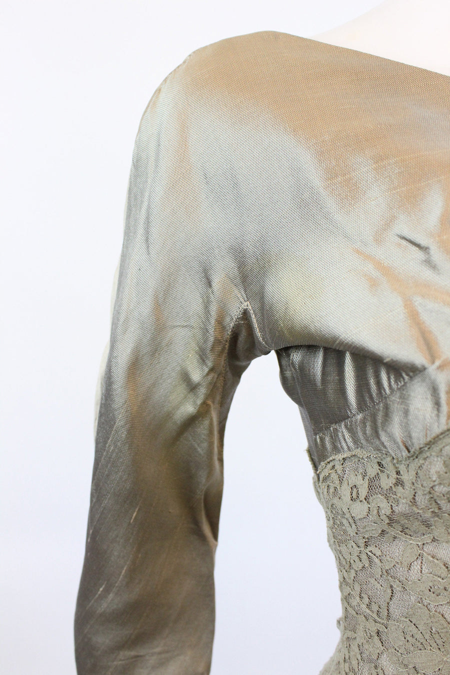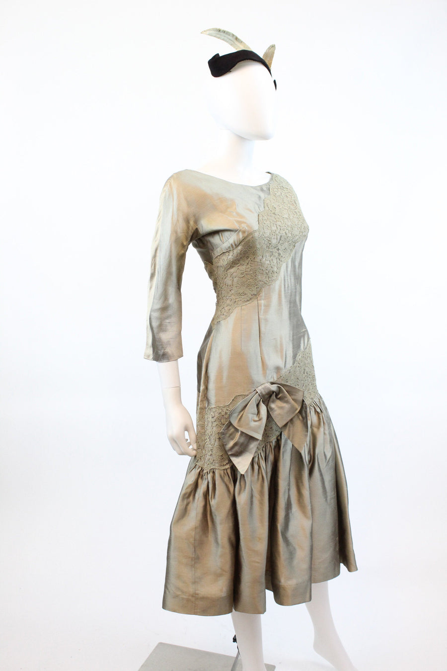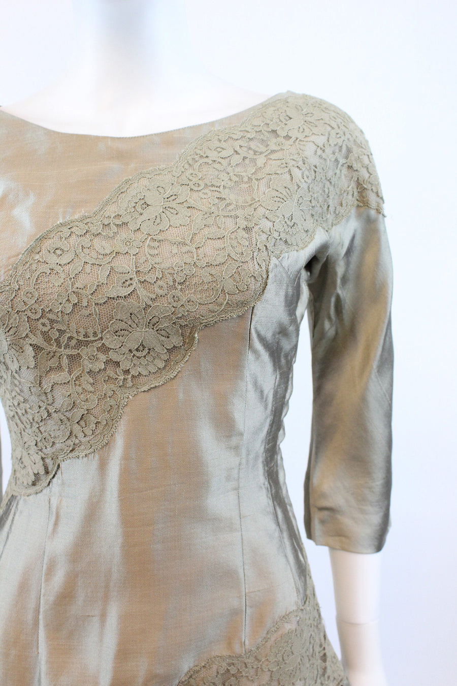 Stunning 1950's tulle confection! Done in a shimmery mushroom color silk and lace. Asymmetrical style with angled slashes of lace. Gathered full flirty flamenco skirt with attached bow. Side metal zip. Fully lined.
