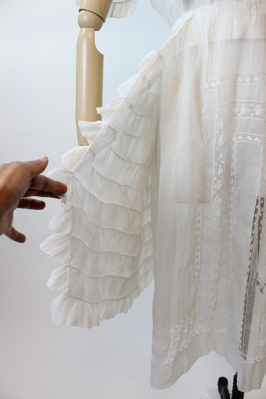 Exquisite antique dress done in sheer white cotton organdy with filet lace. Bib front collar, fitted waist and ruffled panels on the sides of the skirt. Bib in back with decorative teeny buttons. Wide inner grosgrain waist to hold its shape. Hook and eyes at waist and snaps to attach the side panels. Blouse attaches to waist with snaps. Unlined.