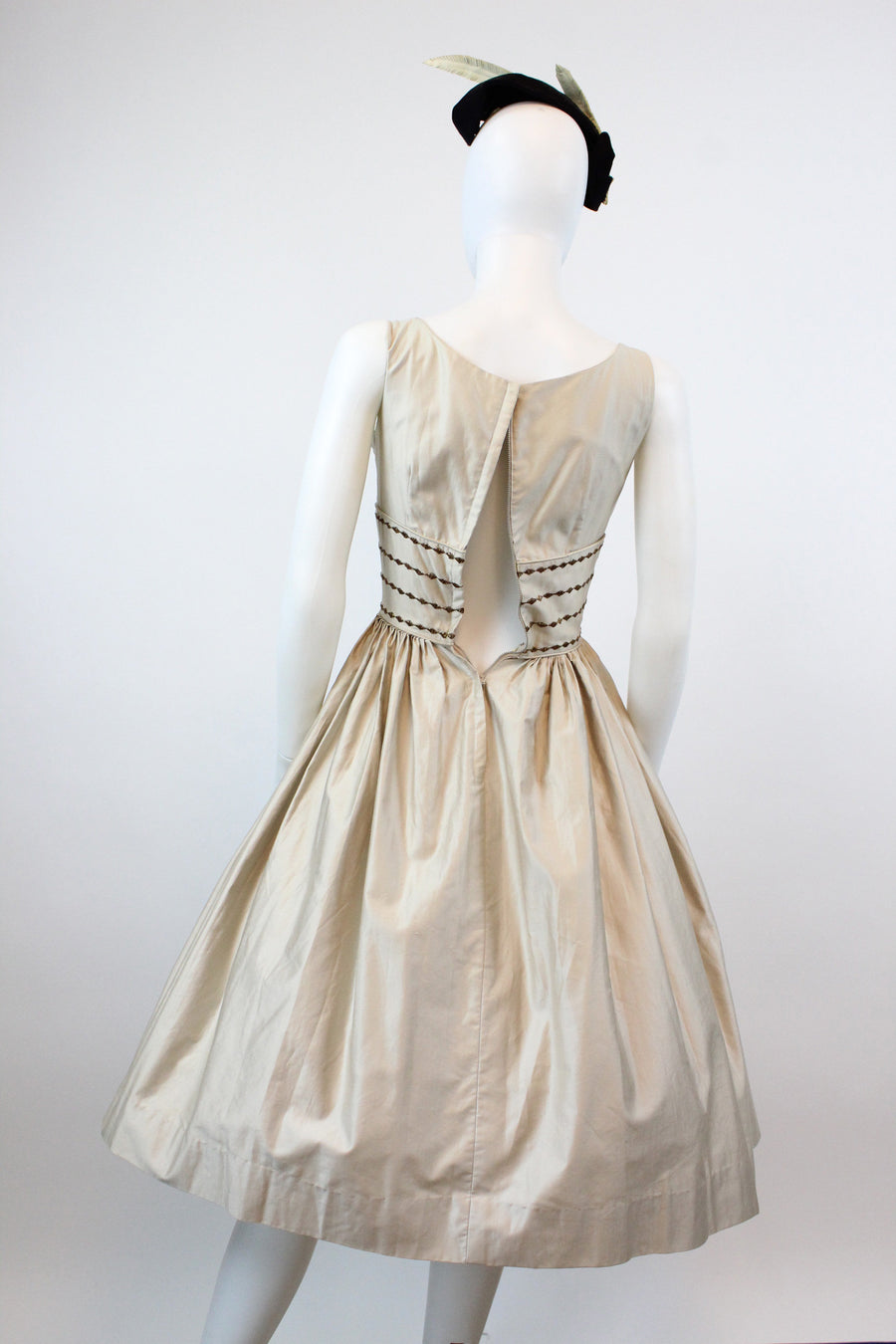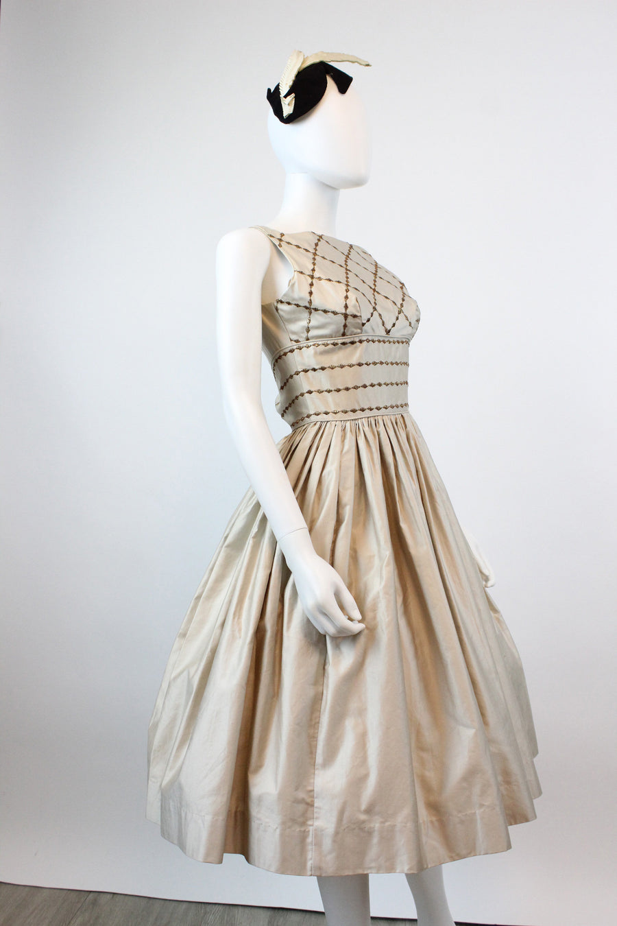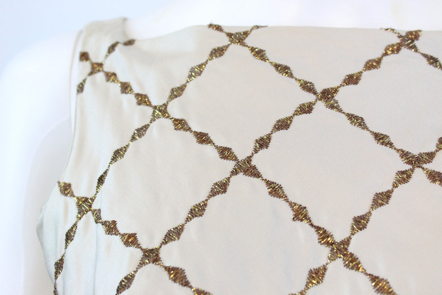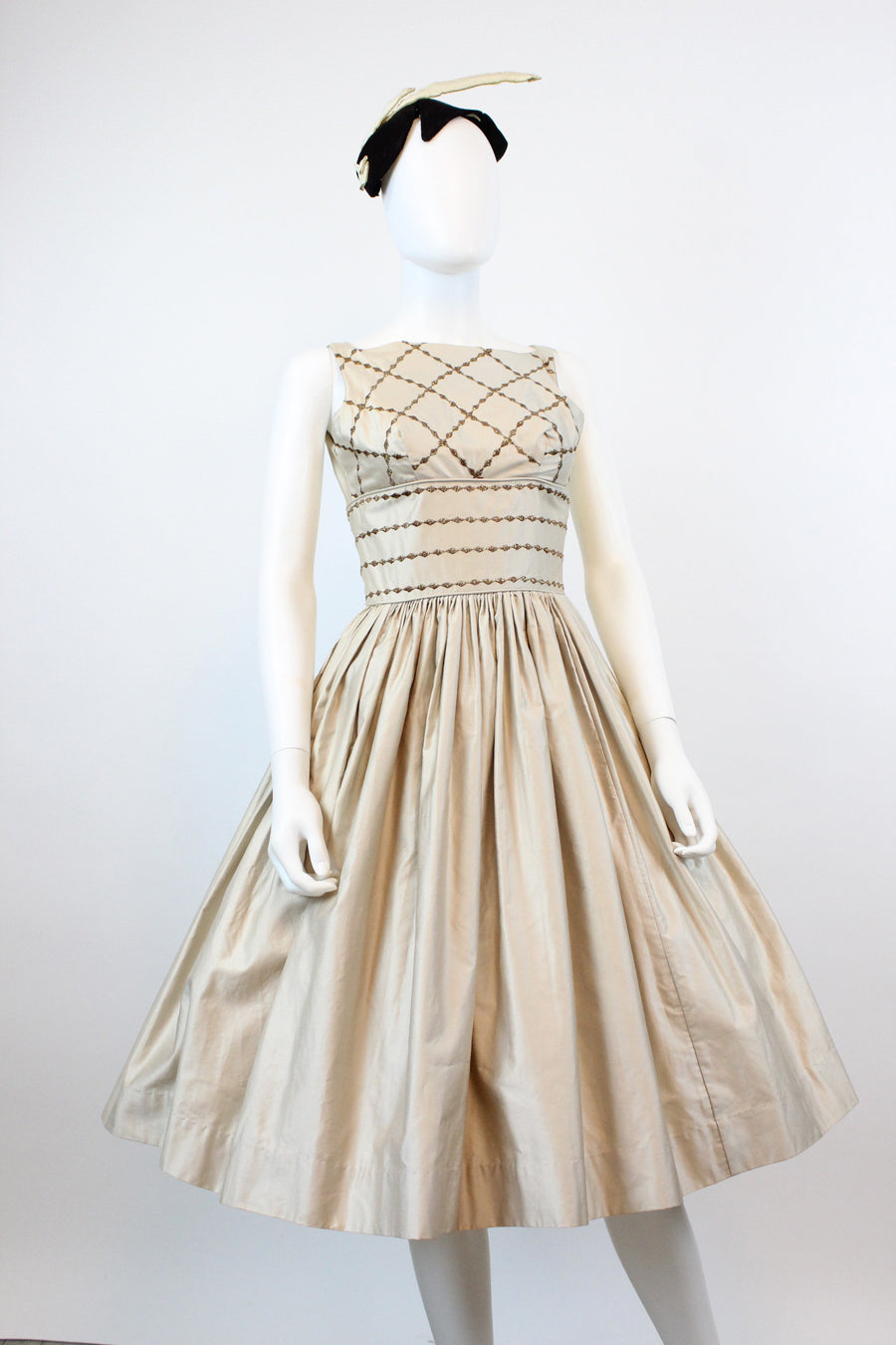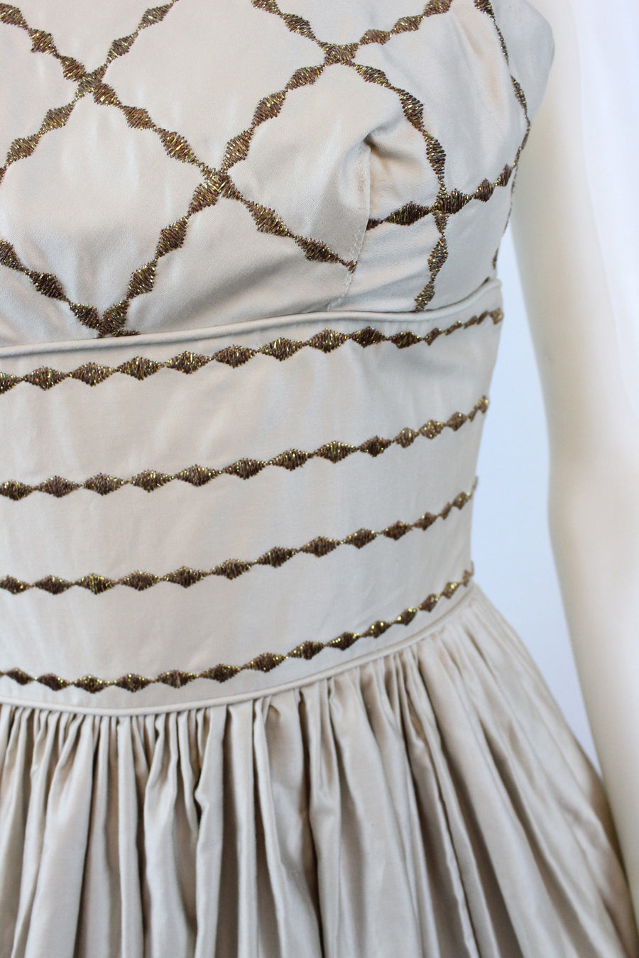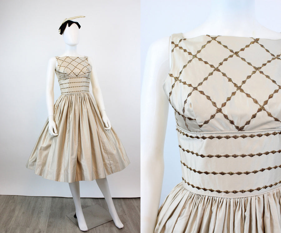 Sweet 1950's deadstock dress! Done in a luxe nude polished cotton with embroidered gold trim in a harlequin pattern. Wide fitted waist and super full skirt. Bodice is lined, skirt is unlined. Back metal zip.