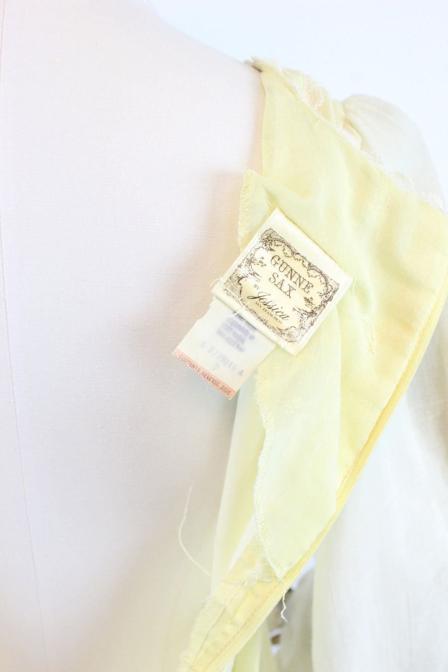 Sweet Gunne Sax maxi dress! Done in super soft yellow floral cotton voile with white sleeves. Lace up corset bodice. Back zipper. Fully lined. Attached ties to cinch waist.