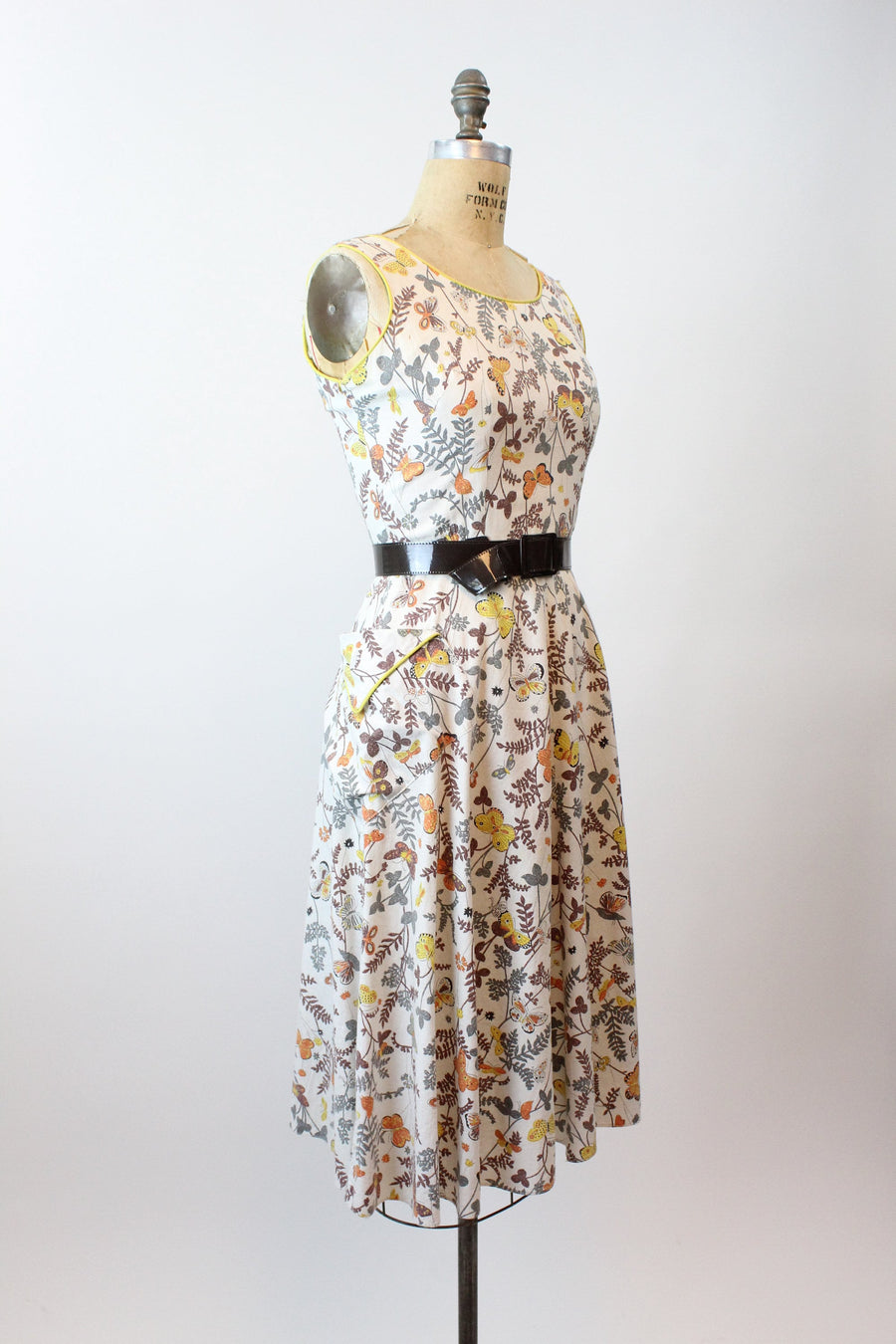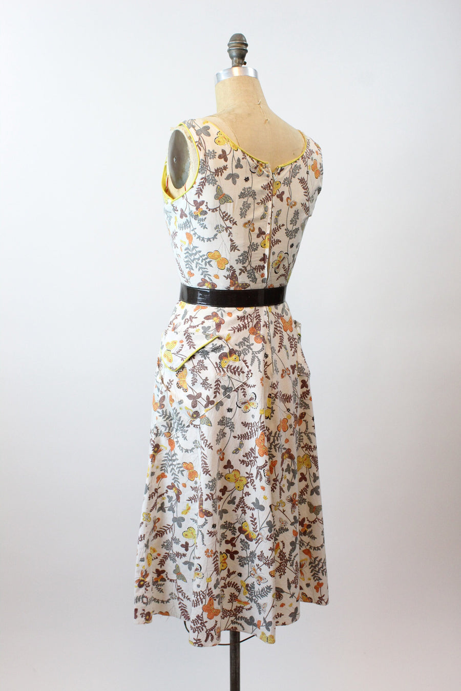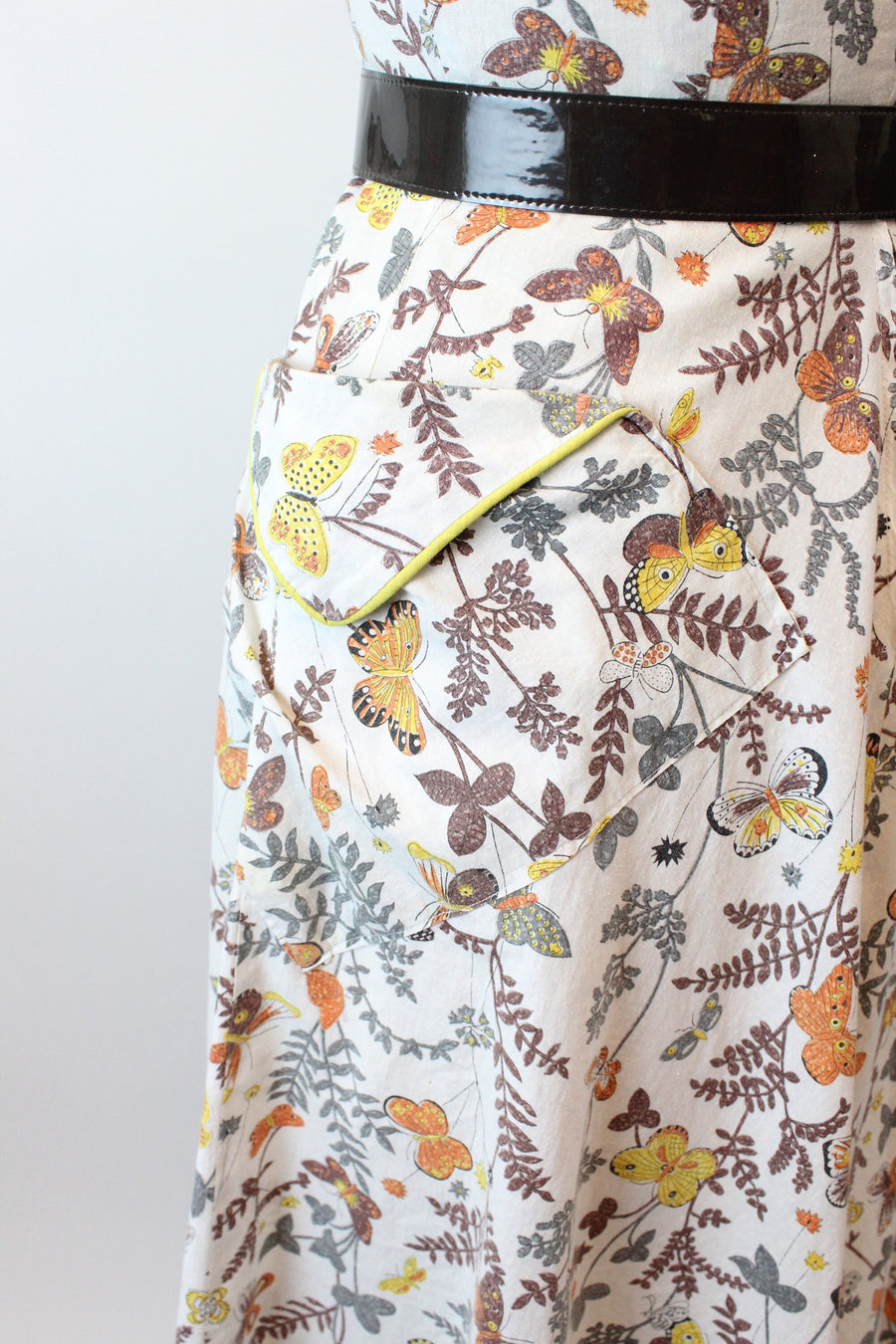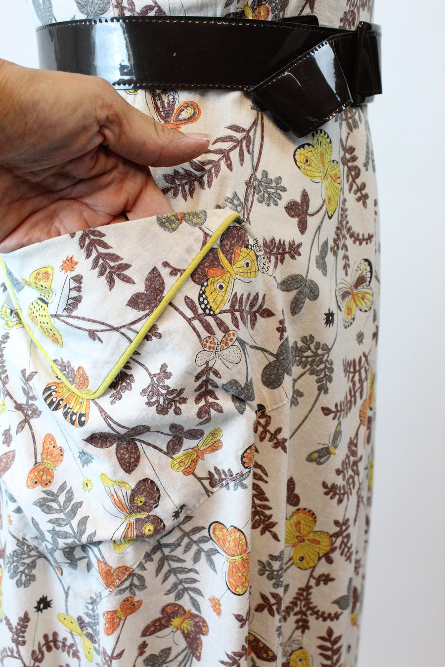 Lovely novelty print 1950's dress done in a white cotton with yellow and orange moths and butterflies alighting on wildflowers. Yellow piping along the neckline and on the folded side hip pockets. Wide brown patent belt. Back metal zip. Unlined.