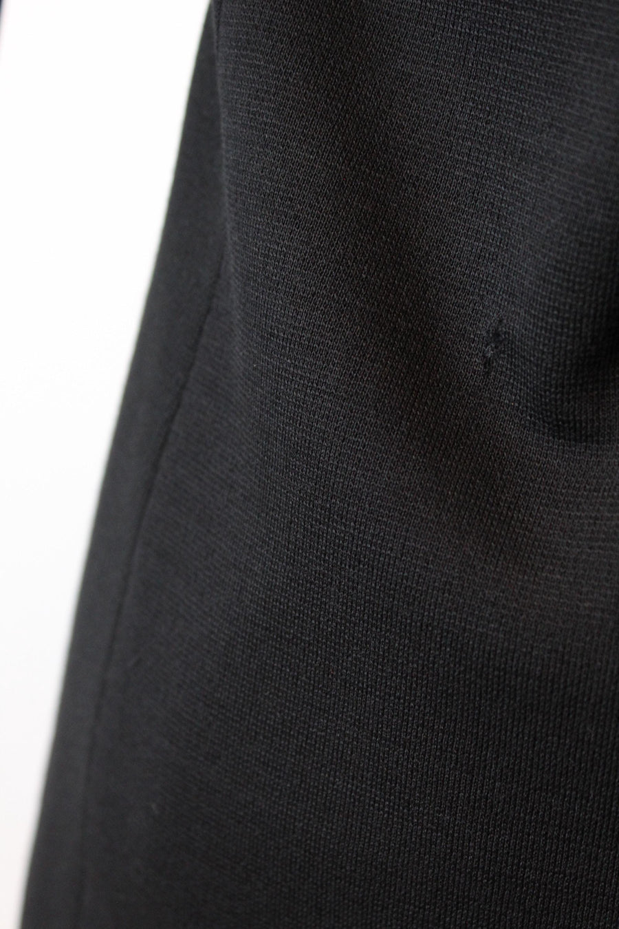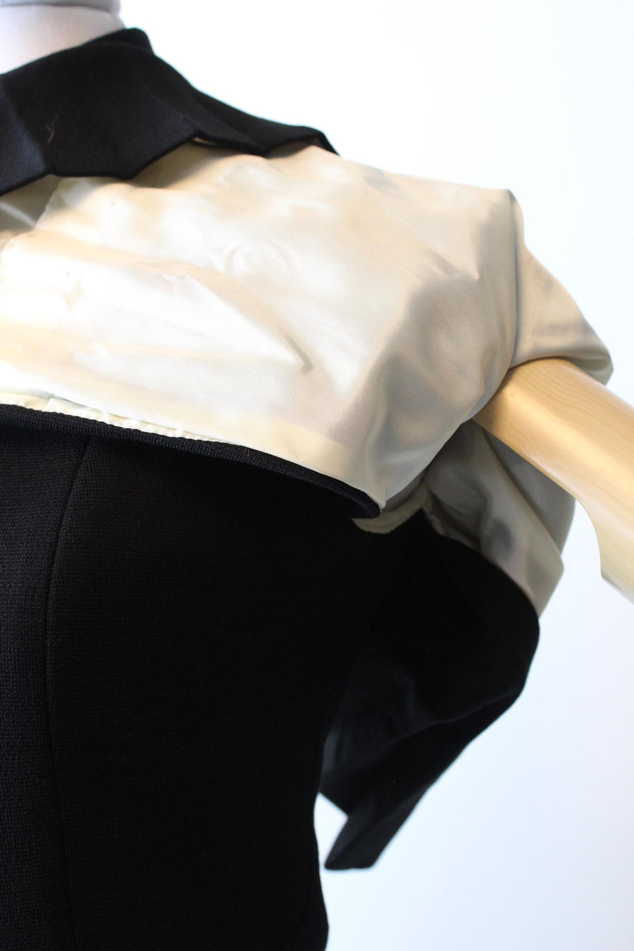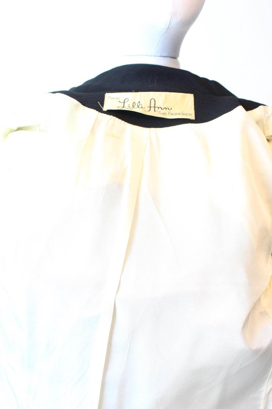 Collectible Lilli Ann jacket done in black wool knit. Tunic style base with attached accordian cape sleeves. Four front buttons and stand up collar. Fitted shape. Fully lined in ivory satin.