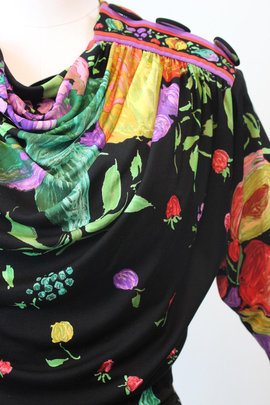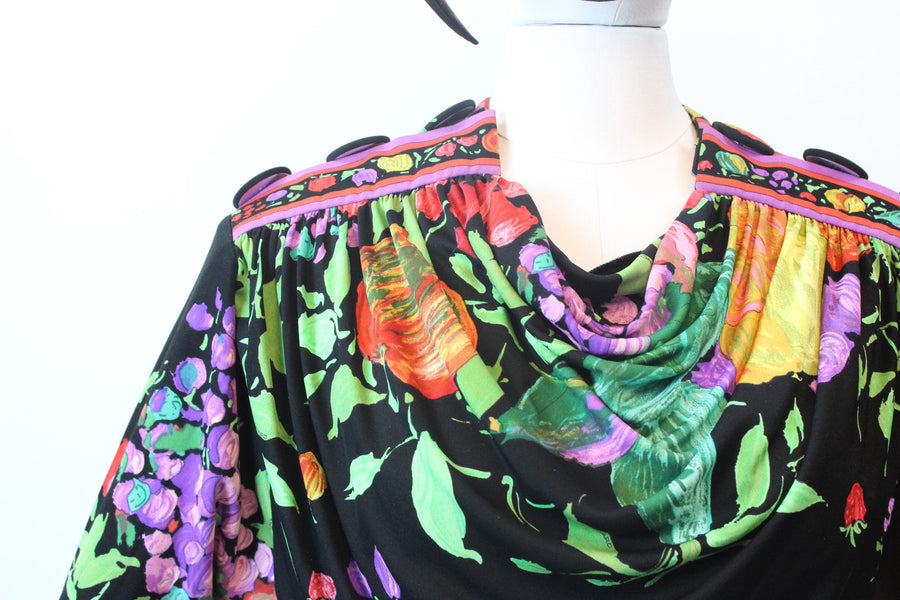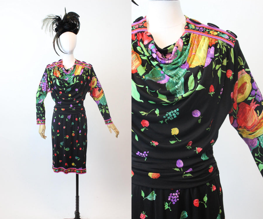 1980s LEONARD OF PARIS fruit flowers silk jersey dress small | new fall winter