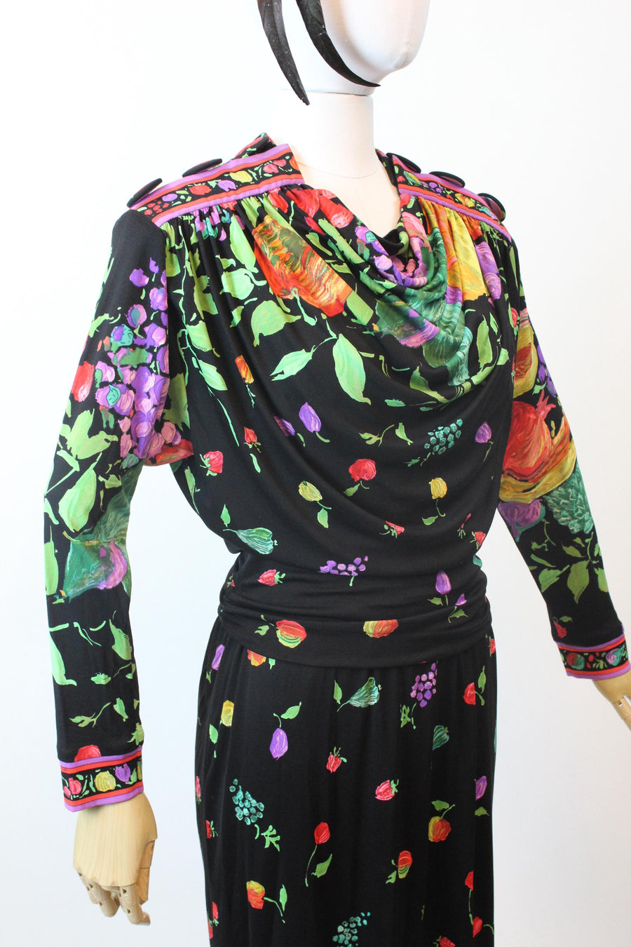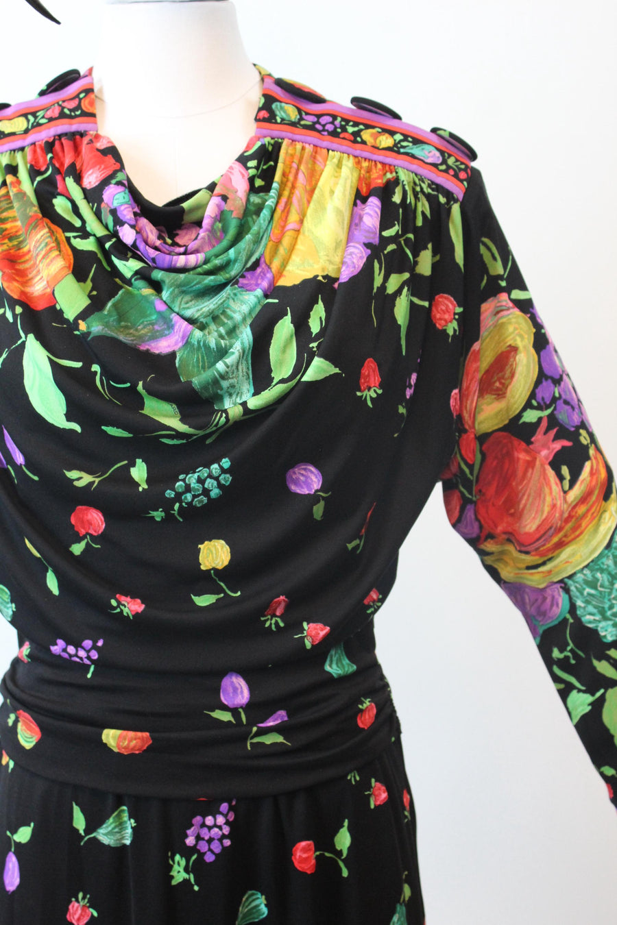 Luxe Leonard of Paris dress that has original tags and an extra button! Done in the lightest silk jersey printed with fruit and flowers on a black background. Leonard logos throughout. Wide batwing sleeves with snug cuffs. Draped cowl neckline, HUGE covered buttons on the shoulders and draped bodice that blousons over the skirt. Small shoulder pads. Back zipper. Unlined. Made in France. We have five of these from the same owner who shipped at Margaret's of Lubbock Texas.