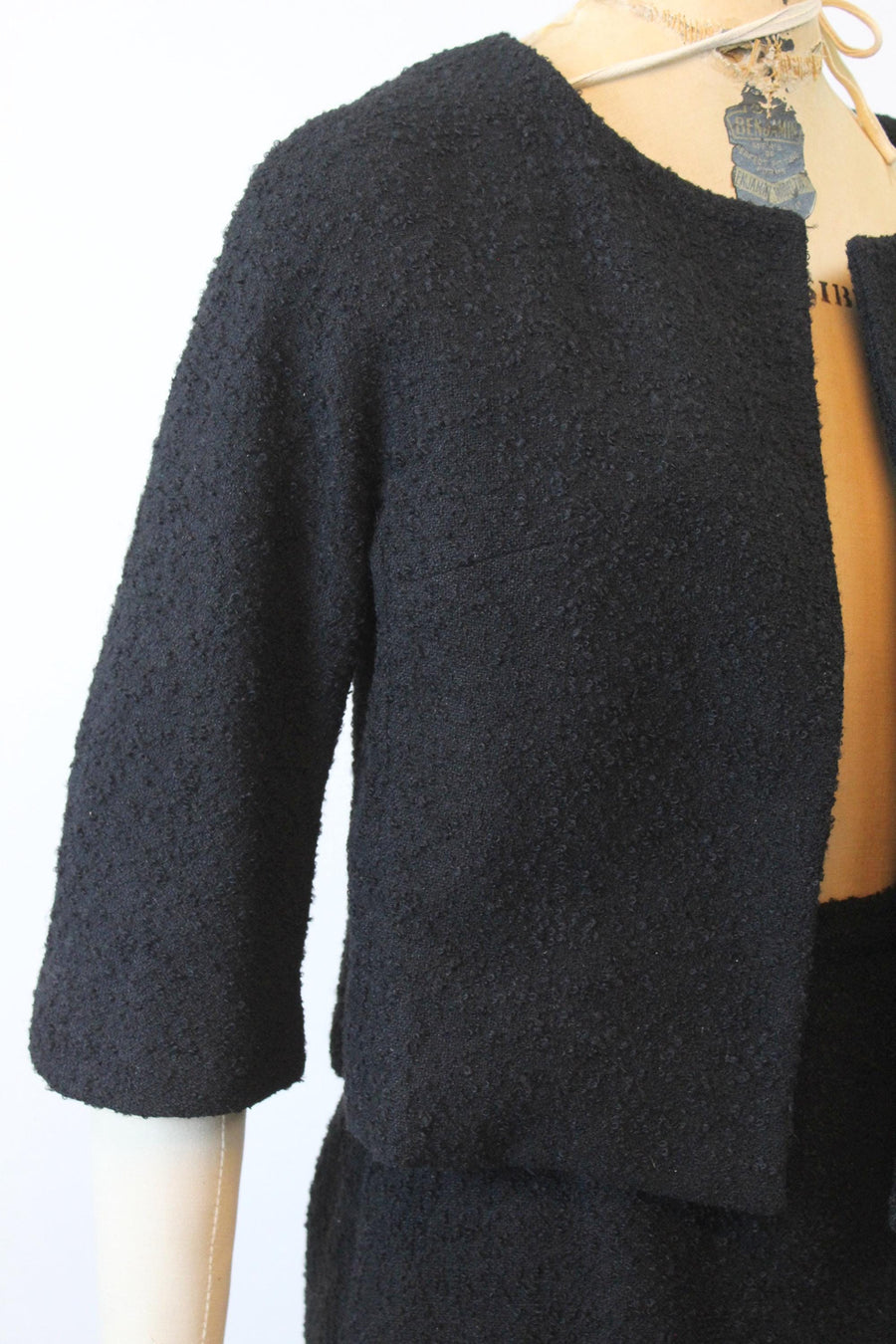 Chic and Chanel-esque 1960's Lilli Ann suit! Done in a wool boucle loomed in Paris. Suit jacket is boxy with no closures and 3/4 length sleeves. Skirt is fitted with side button and metal zip and is partially lined.
