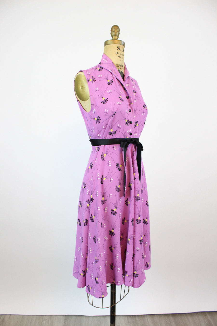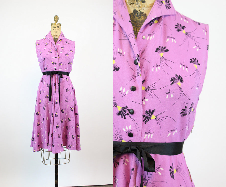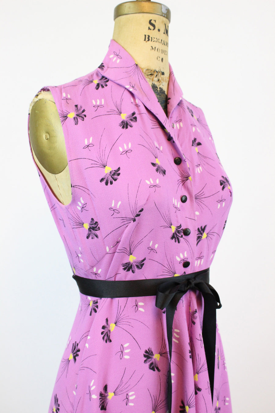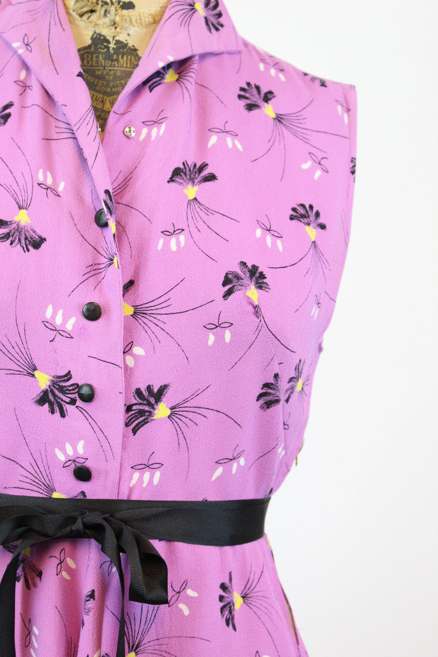 Sweet 1940's dress! Done in a linen/rayon blend in vivid lavender with black and yellow flowers. Front snaps with decorative button, fitted waist and a-line skirt. Side metal zip. Unlined. Belt not included.