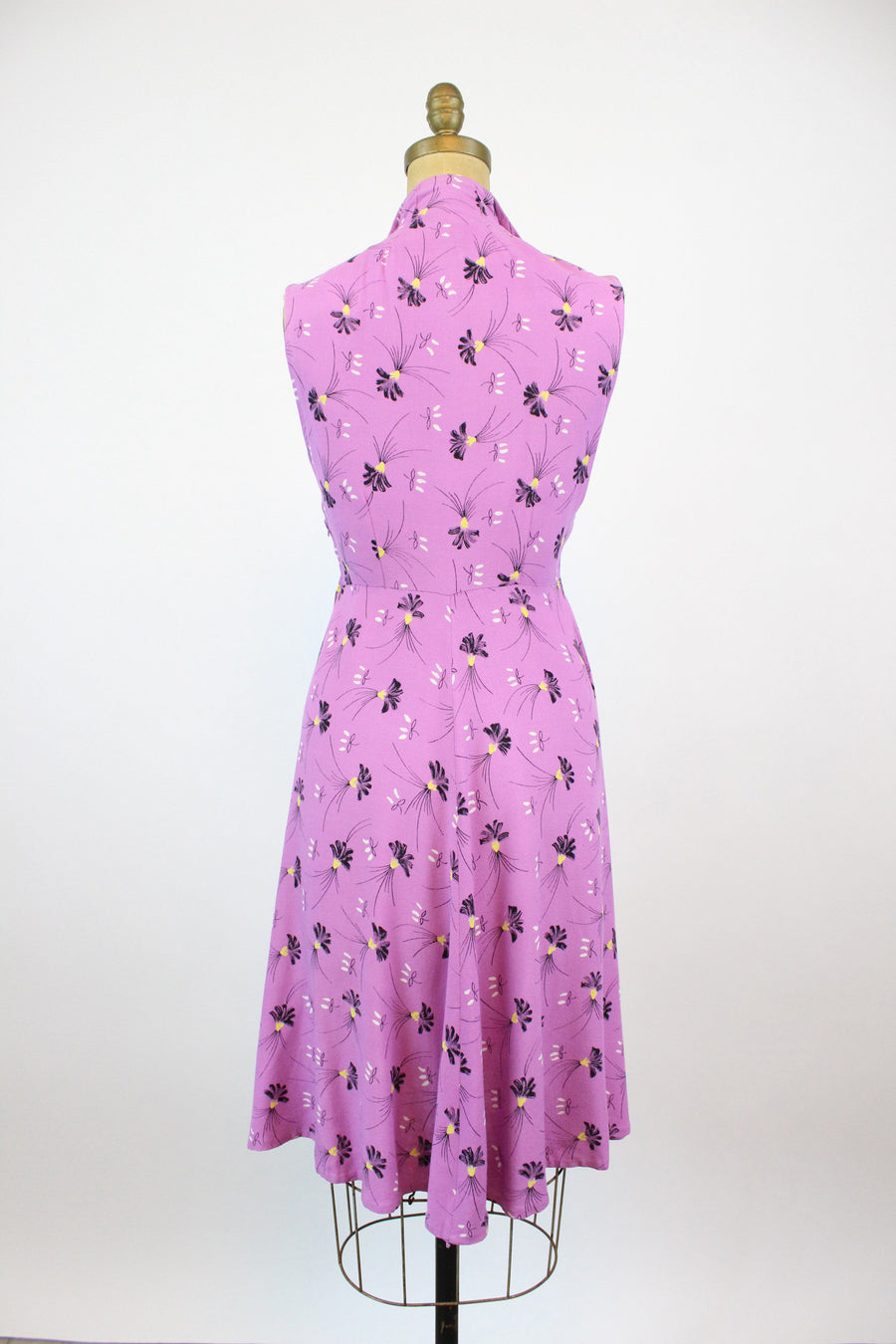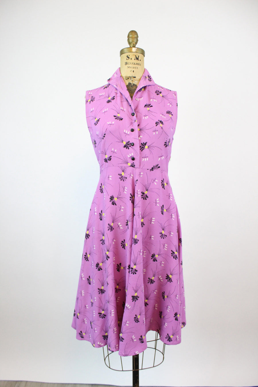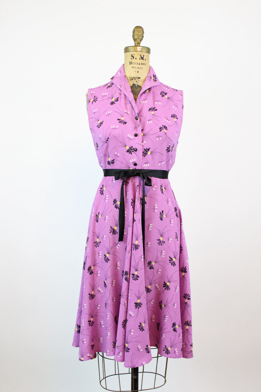 Sweet 1940's dress! Done in a linen/rayon blend in vivid lavender with black and yellow flowers. Front snaps with decorative button, fitted waist and a-line skirt. Side metal zip. Unlined. Belt not included.