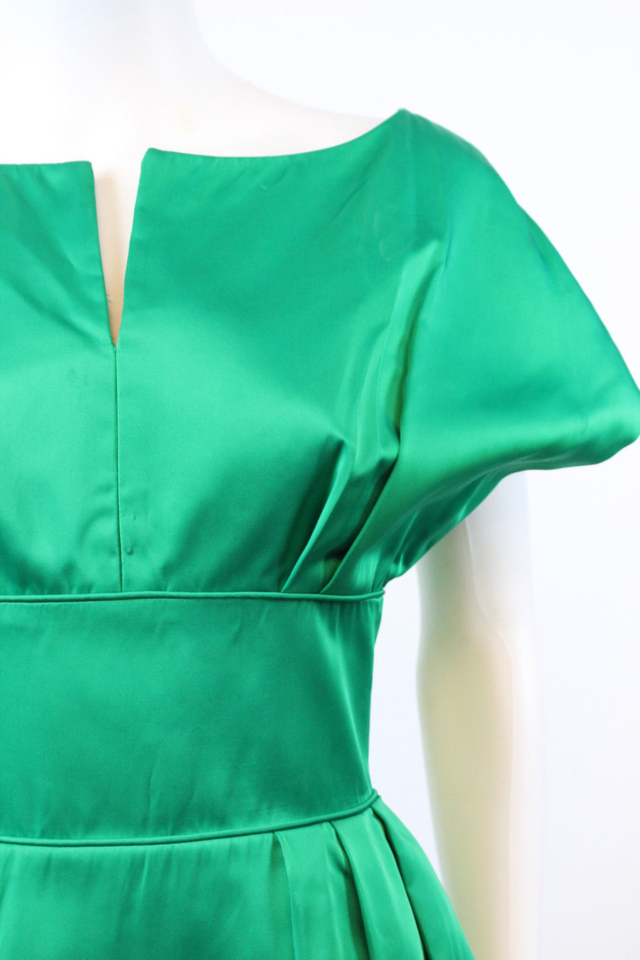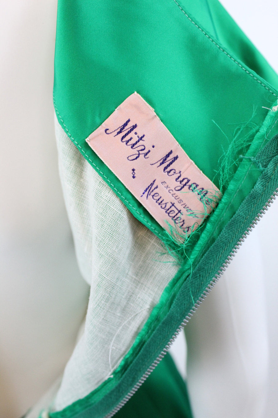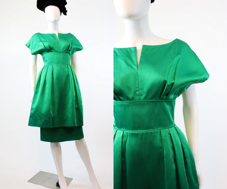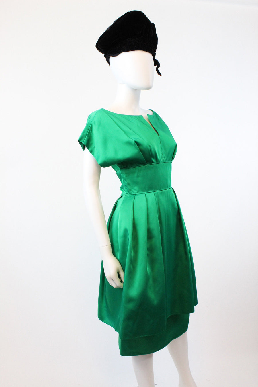 Stunning 1950's dress! Done in a brilliant emerald green heavy satin. Quality workmanship with linen lining in the bodice and satin on the skirt. Double skirt with a pleated bubble skirt over the long lean skirt. There is netting under the bubble skirt for fullness! Notched neckline, wide dolman arm holes and fitted wide waist. Back metal zip.