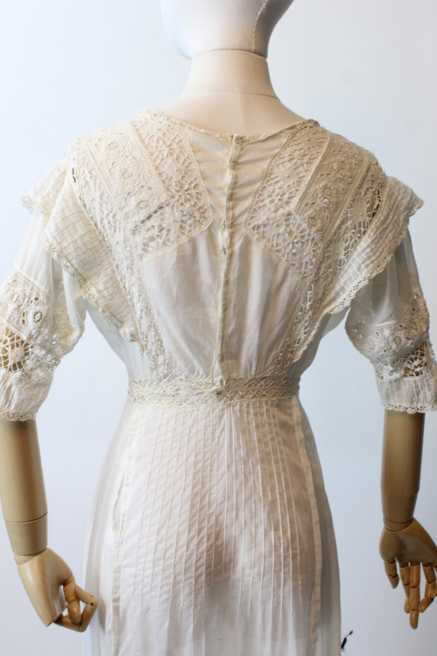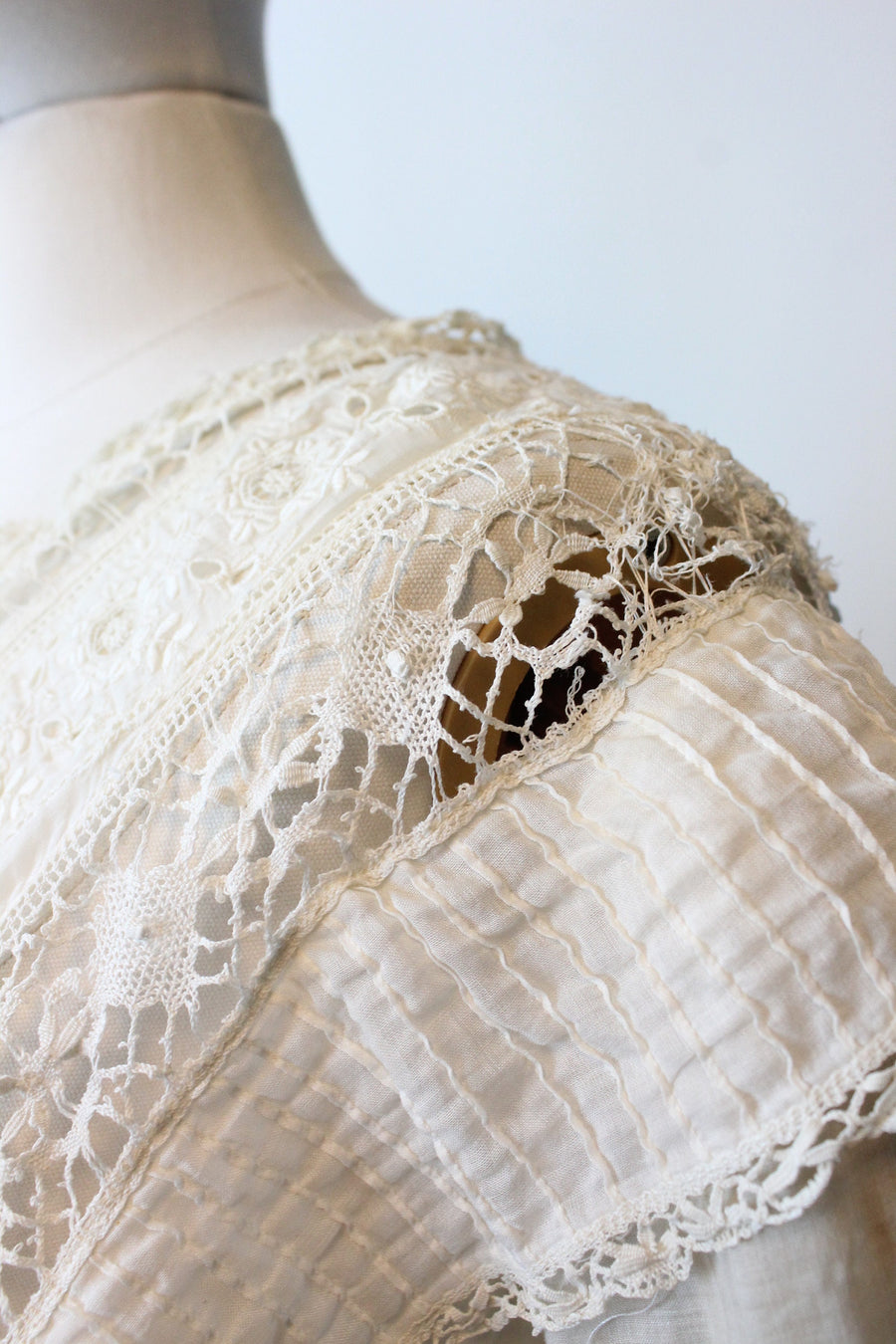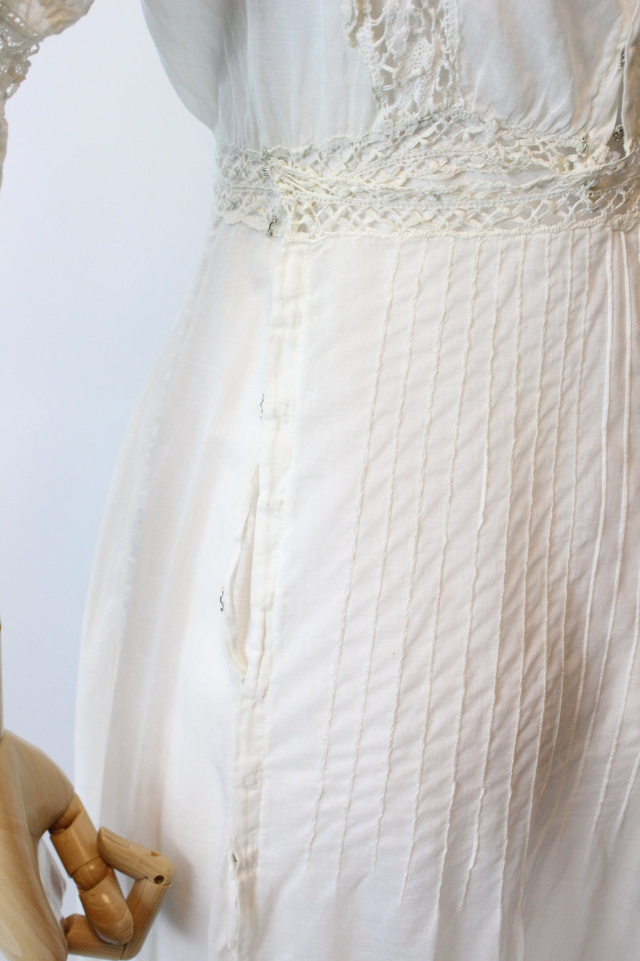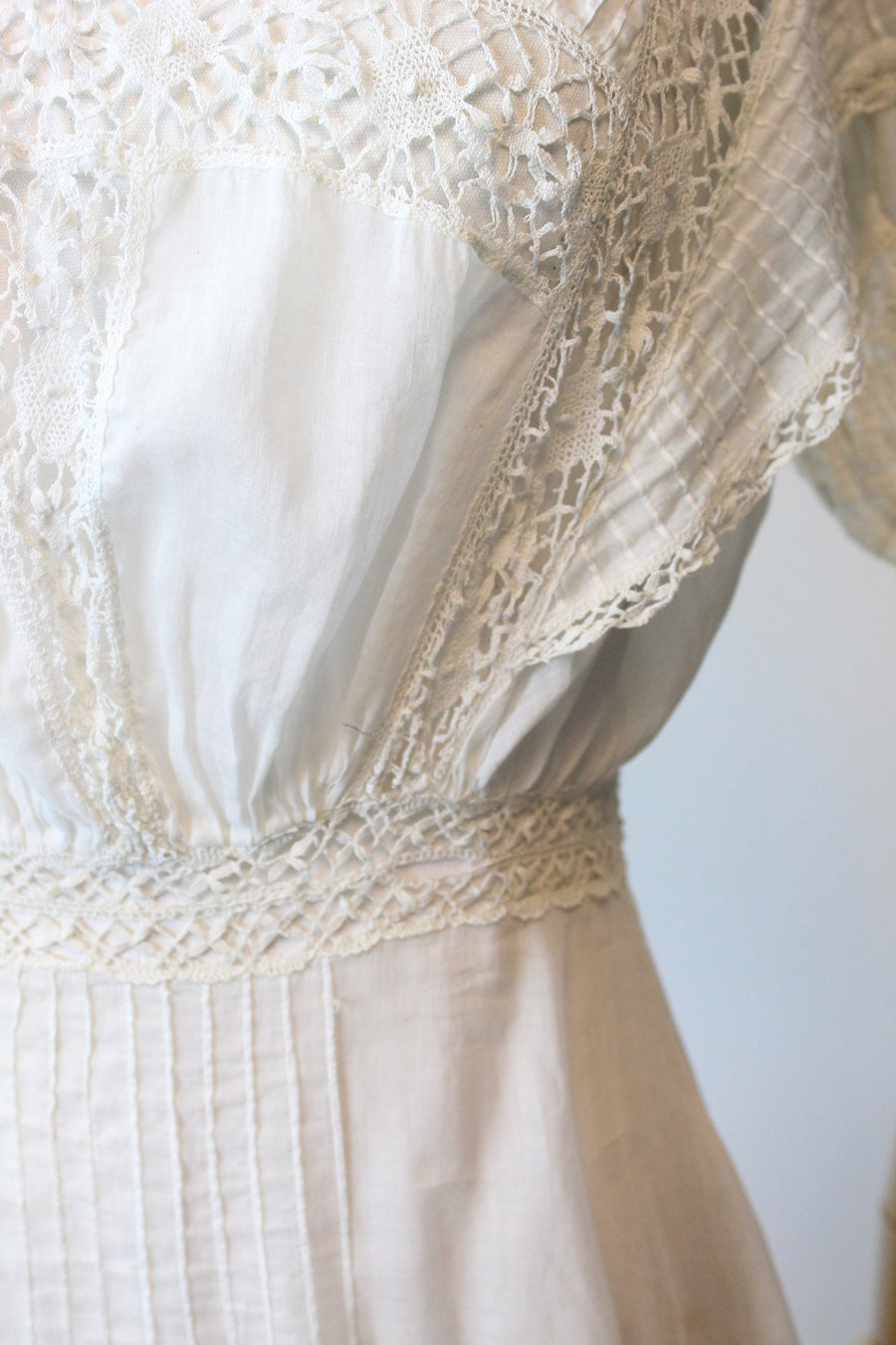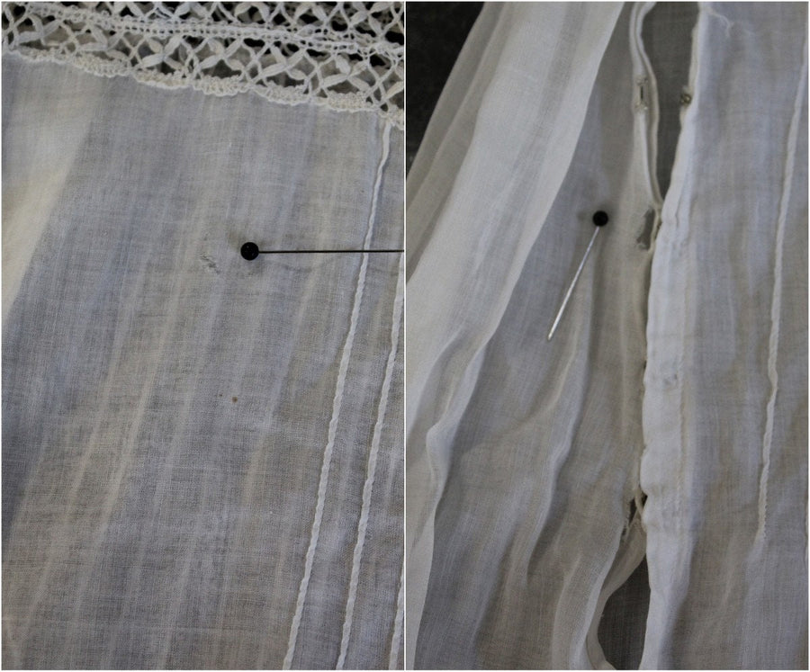 Condition: Very Good Vintage : Some tiny breaks in lace at the shoulders (see last pic). Hook and eyes work fine but the cotton is worn down so there are some small breaks near the closures, this is due to the age. (see next to last pic) Some very faint discolorations down the front of the skirt. A few pin dot holes in the hemline. Still very strong and wearable and these flaws do not take away or overpower the beauty of this antique dress!