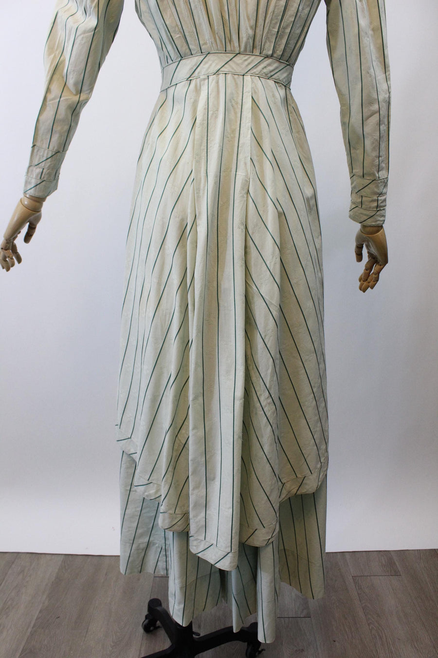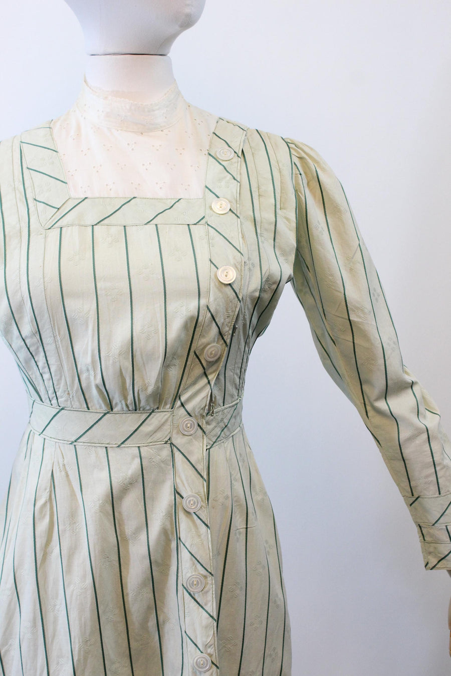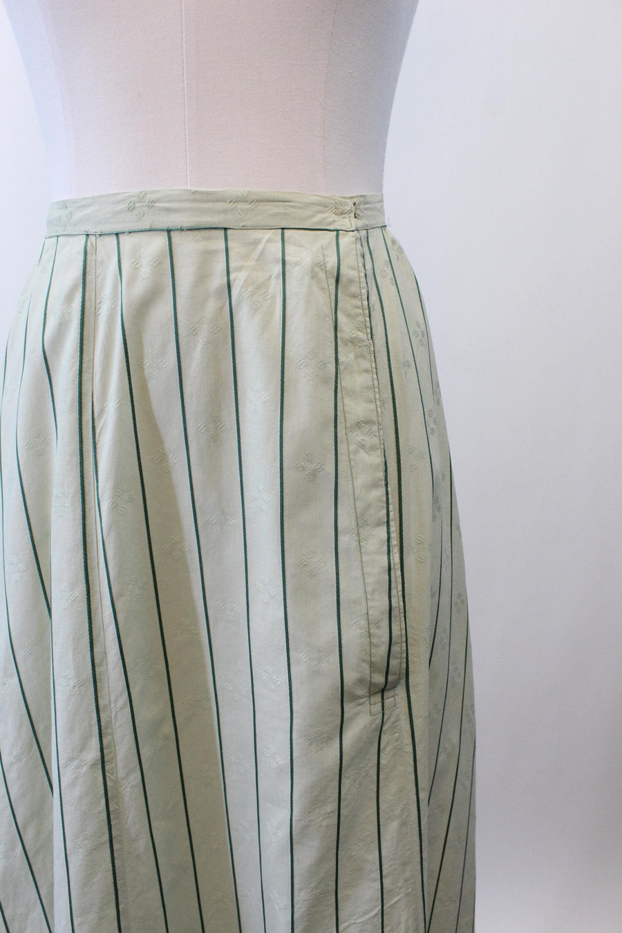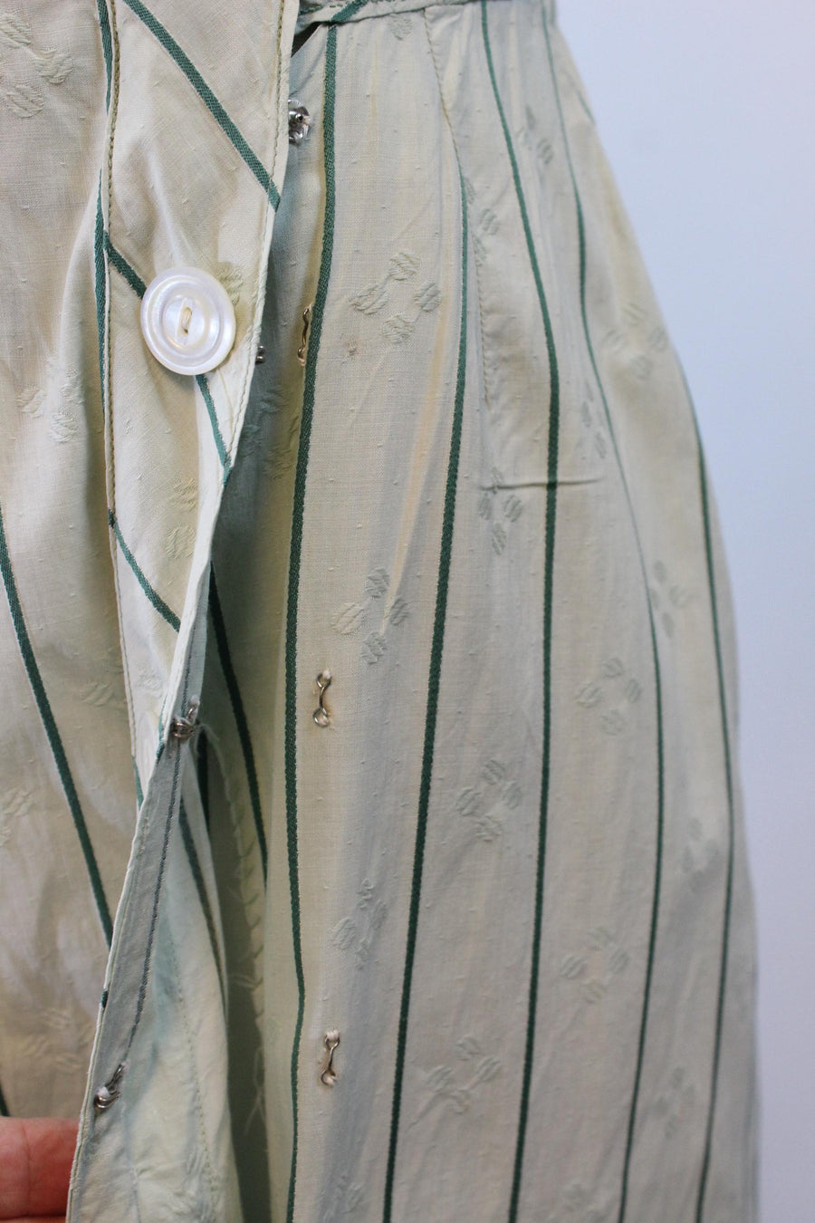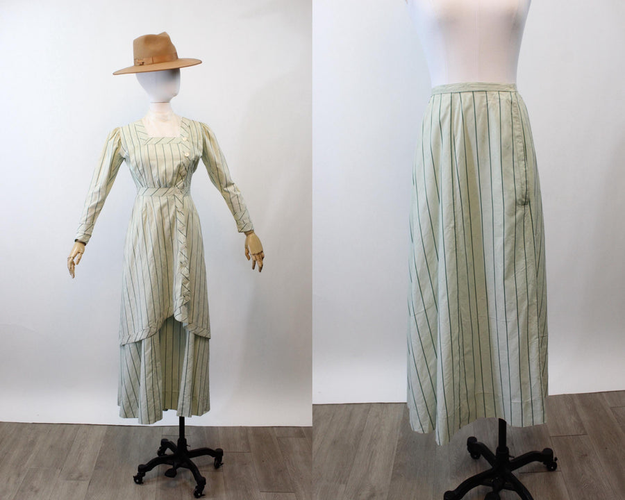 Where do we start with this RARE two piece Edwardian set! Done in the prettiest mint green cotton jacquard with dark green stripes. The dress/blouse has an eyelet collar and decorative buttons asymmetrically placed. There are hook and eyes beneath the buttons. The hem in back is longer in the back! The skirt also has hook and eyes that are asymmetrically placed. Unlined. It is so hard to find these sets in such good condition! A true museum piece. Hand laundered and ready to wear.