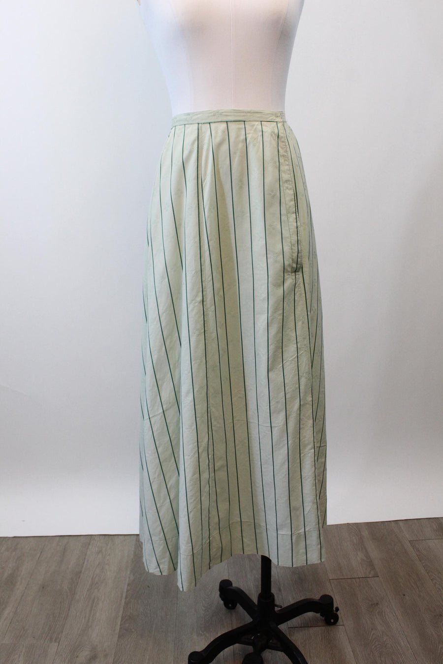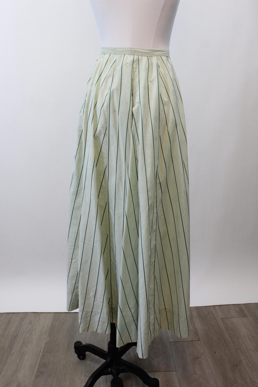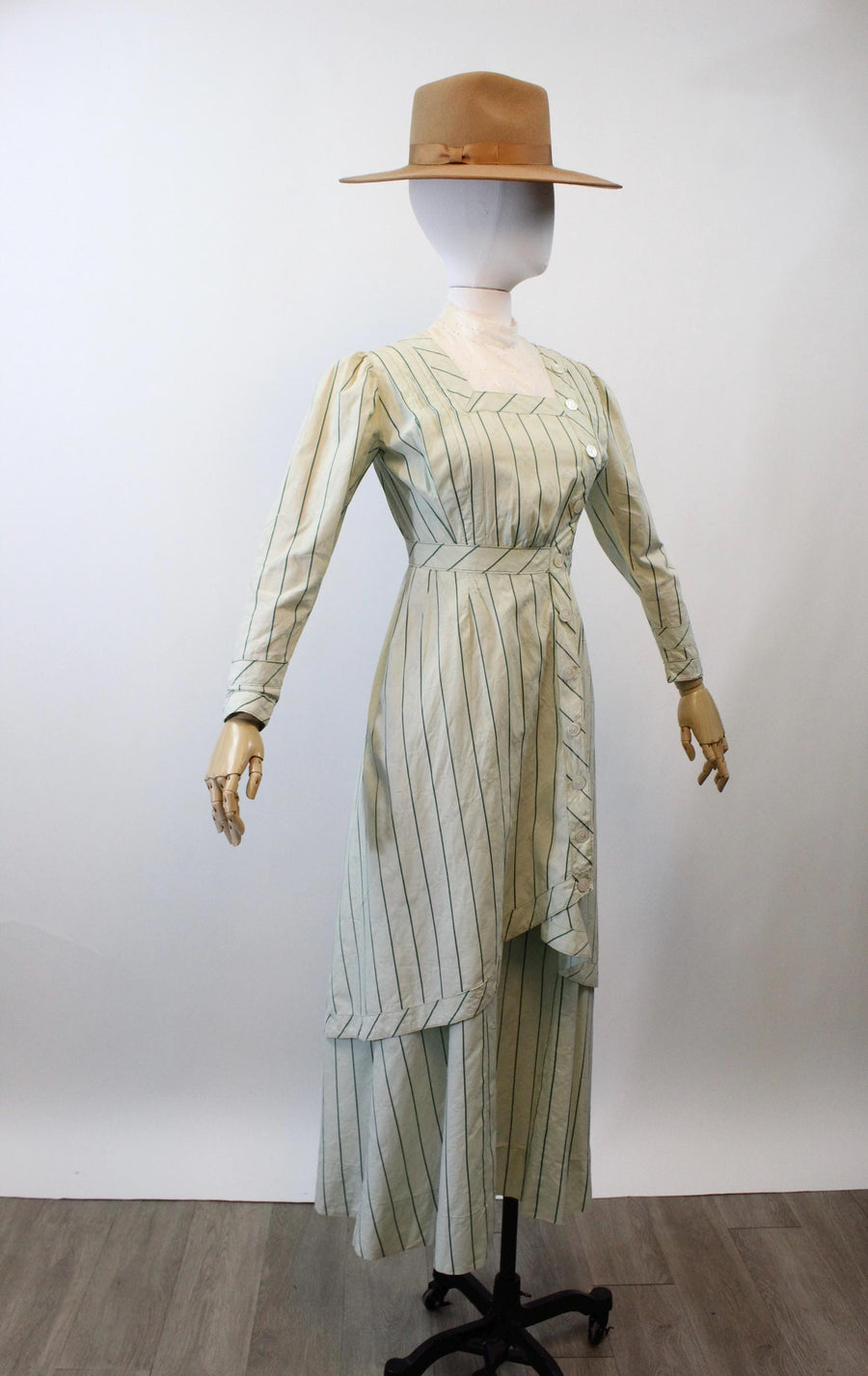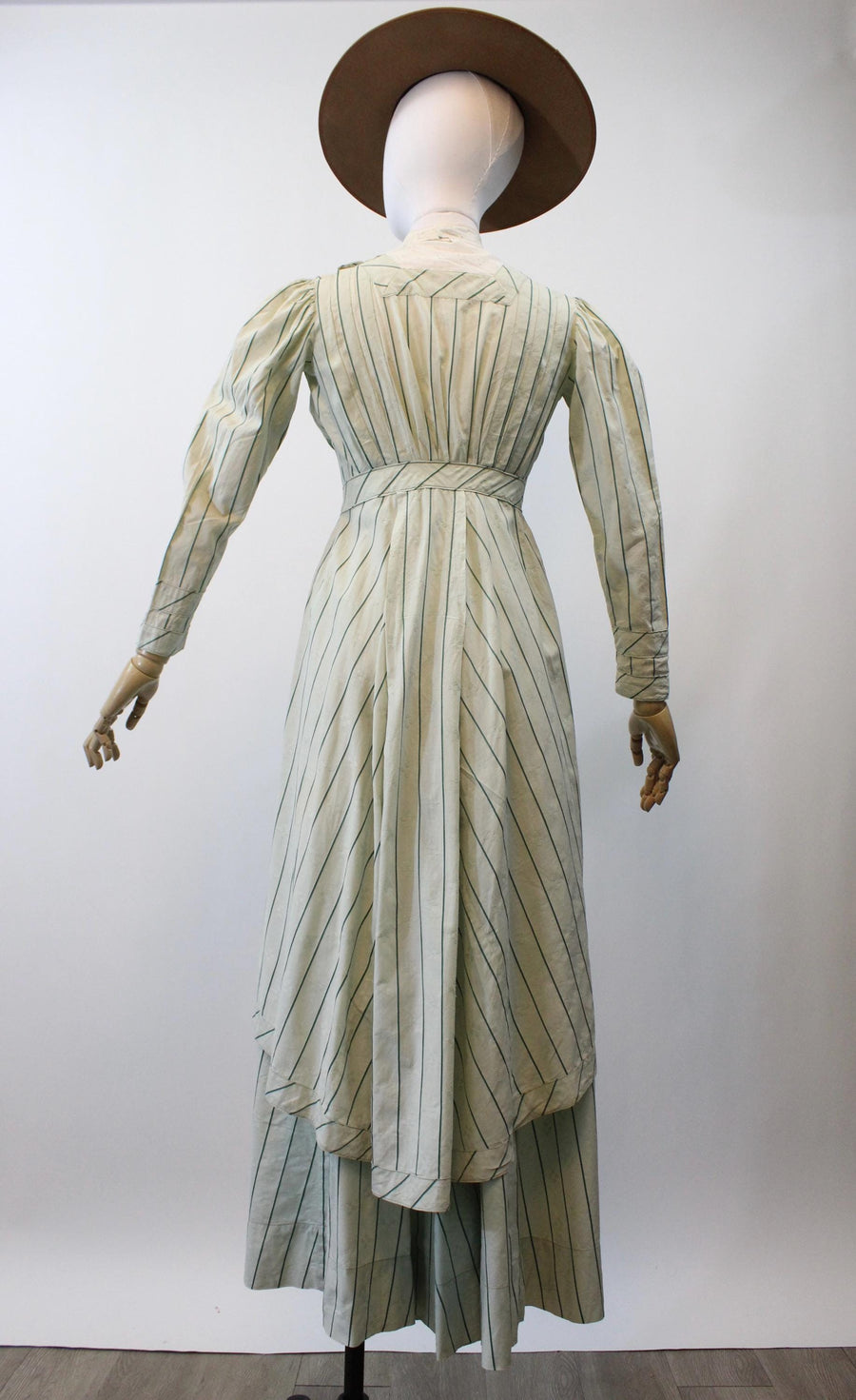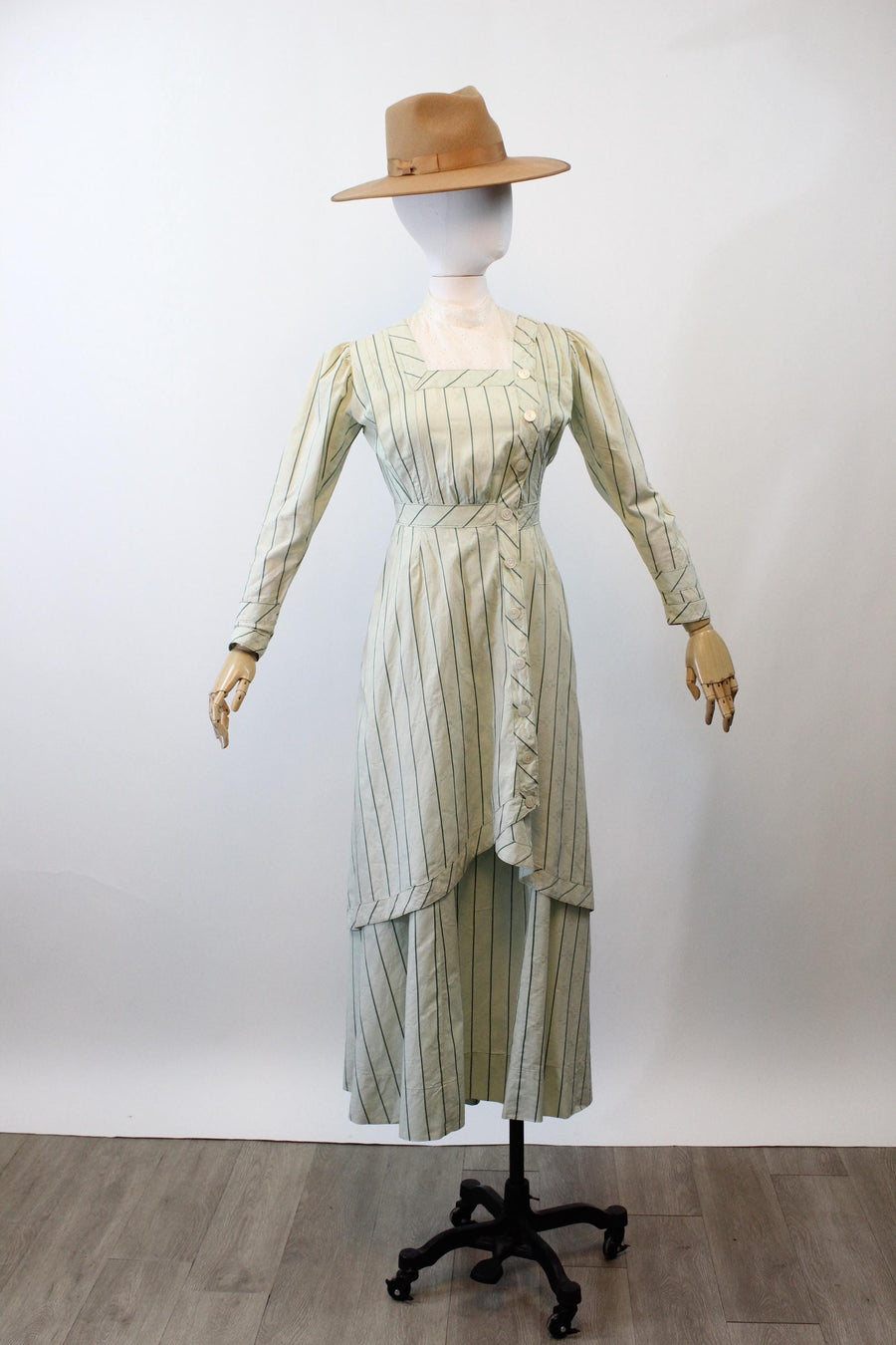Where do we start with this RARE two piece Edwardian set! Done in the prettiest mint green cotton jacquard with dark green stripes. The dress/blouse has an eyelet collar and decorative buttons asymmetrically placed. There are hook and eyes beneath the buttons. The hem in back is longer in the back! The skirt also has hook and eyes that are asymmetrically placed. Unlined. It is so hard to find these sets in such good condition! A true museum piece. Hand laundered and ready to wear.