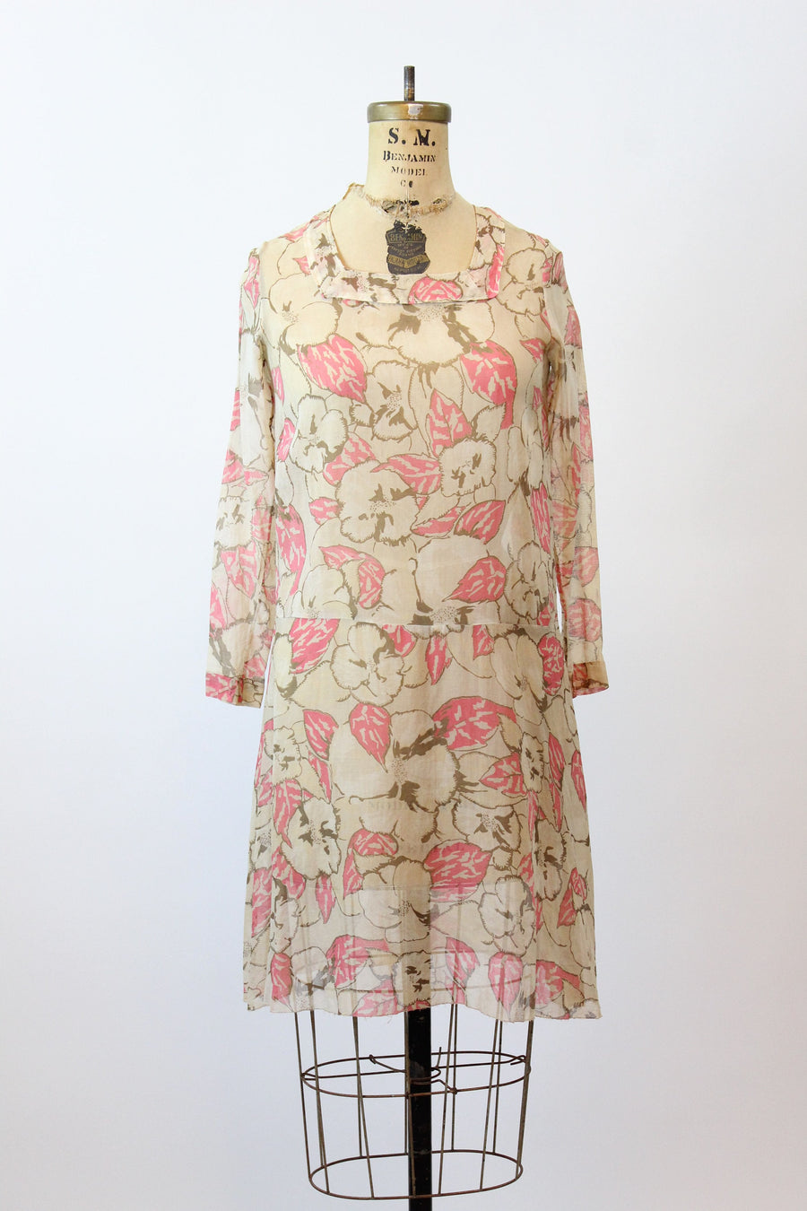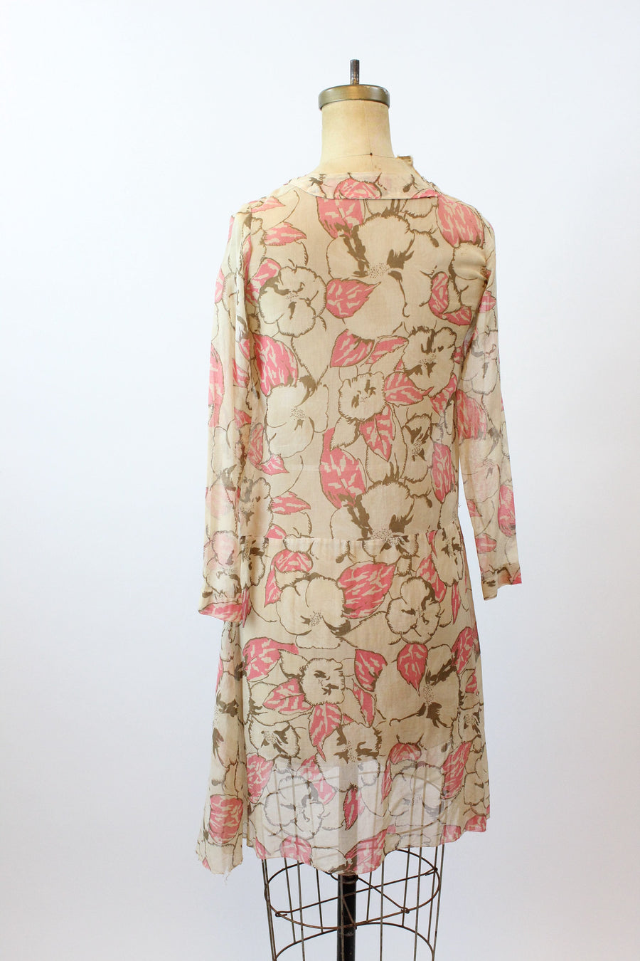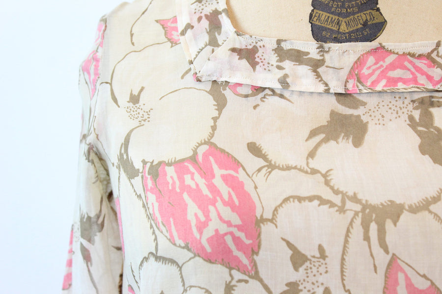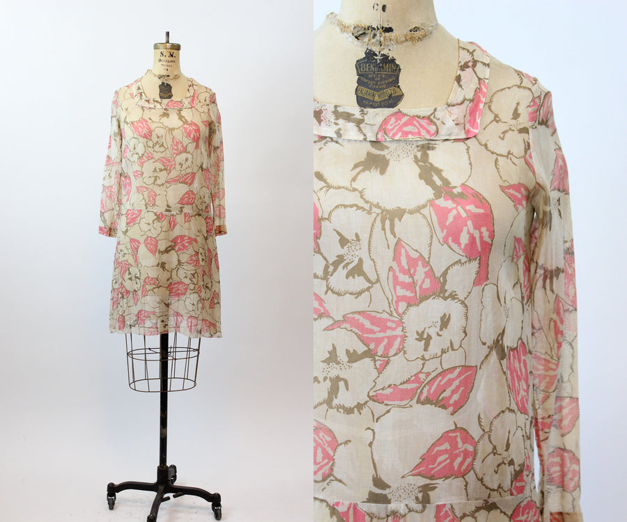 Darling 1920s rare cotton voile dress! Done in a large scale brown and pink floral with square neckline, dropwaist seam and slit cuffs. Pullover style and unlined.