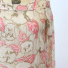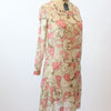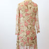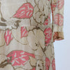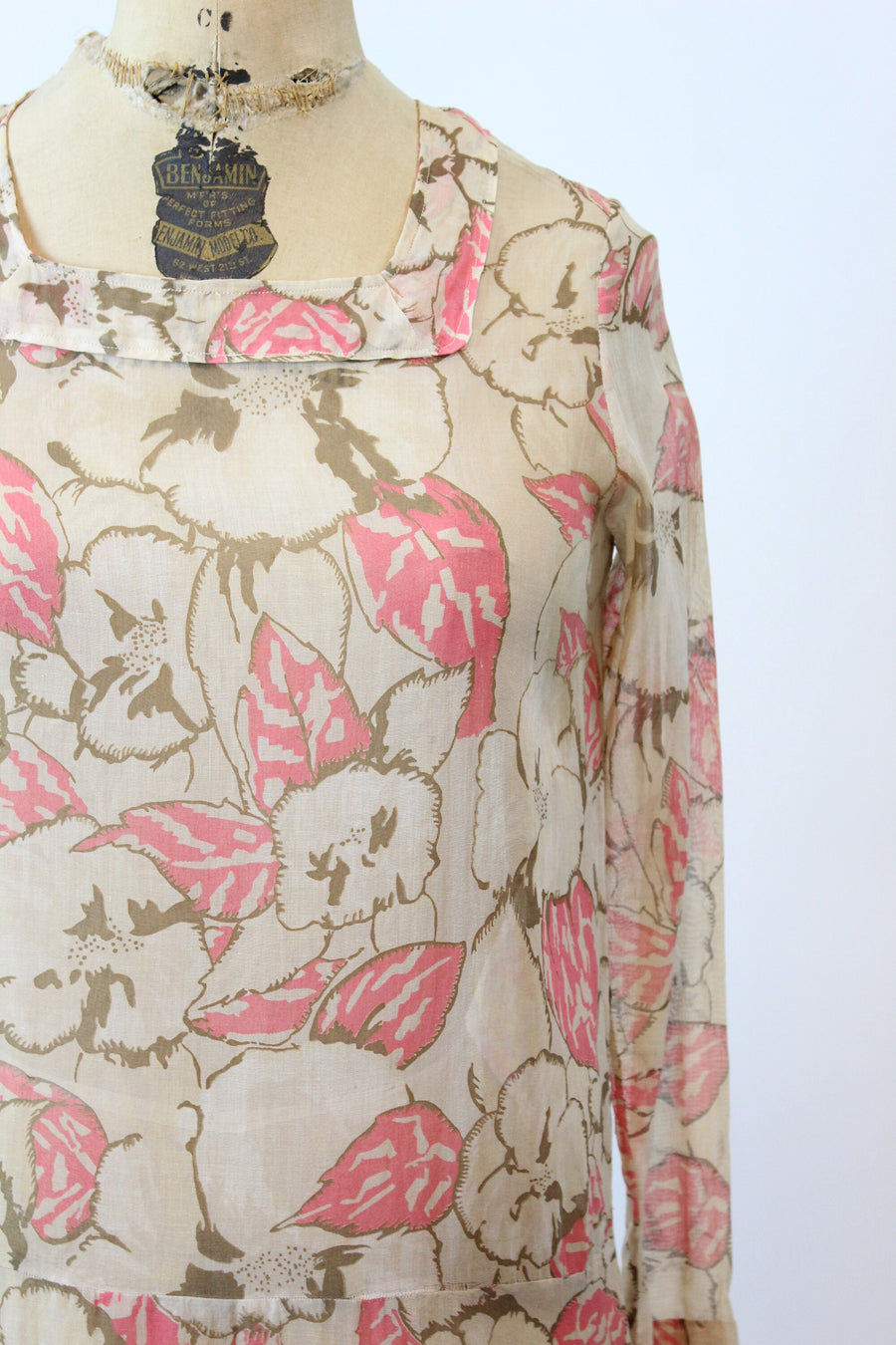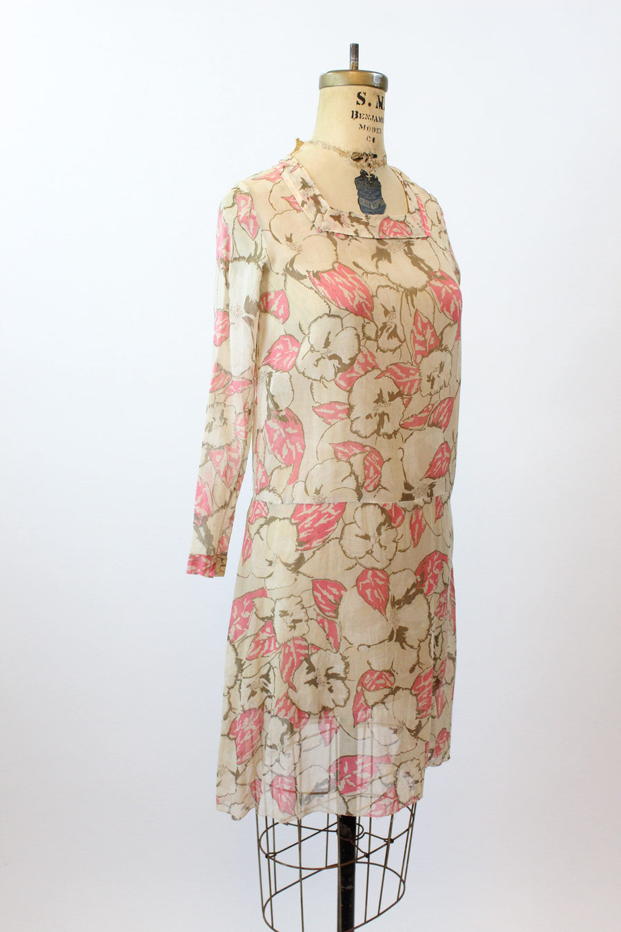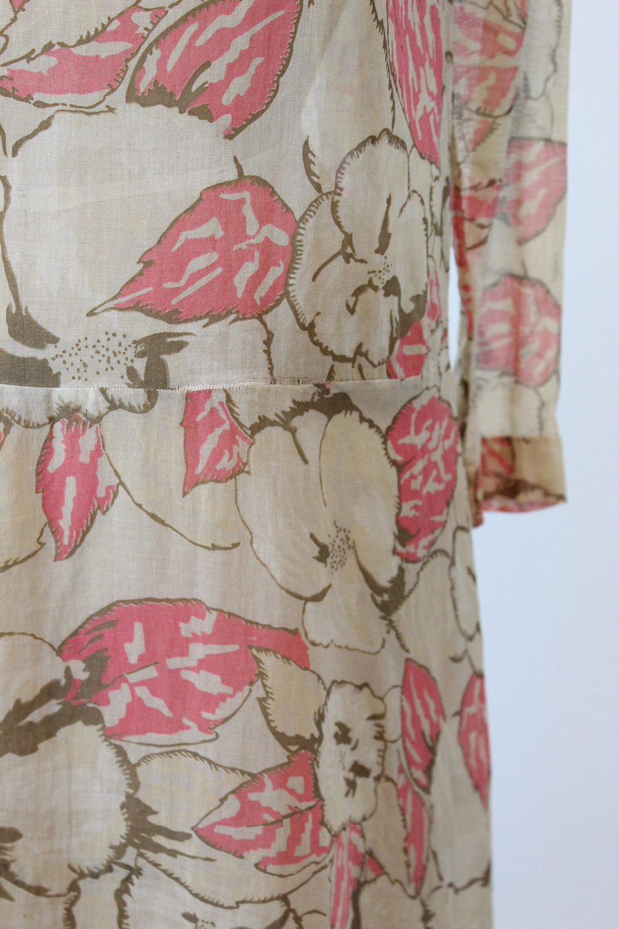 Darling 1920s rare cotton voile dress! Done in a large scale brown and pink floral with square neckline, dropwaist seam and slit cuffs. Pullover style and unlined.