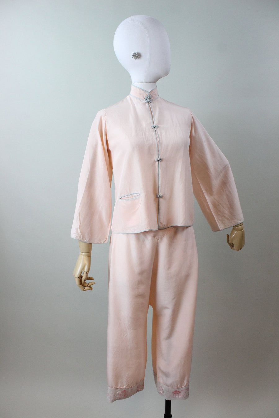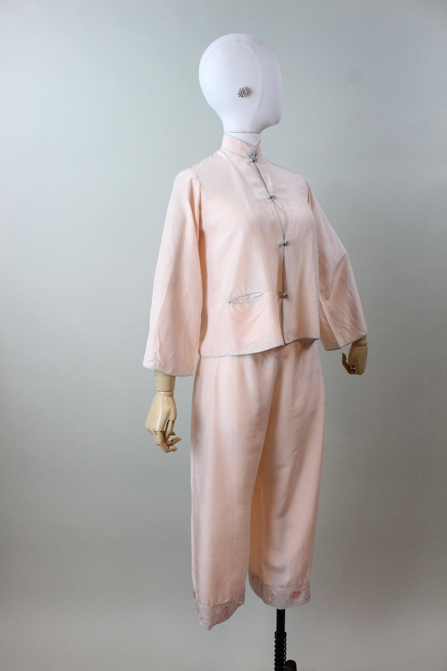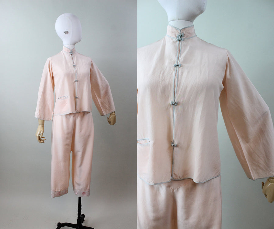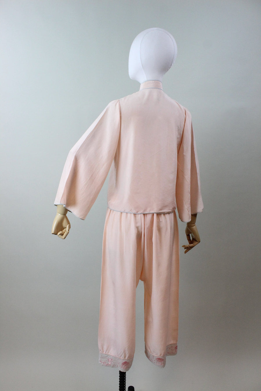 Covetable 1930's silk pajama set! Can be worn in a number of ways, as a true pajama/sleepwear set, as a top or as wide leg pants! Done in peachy pink silk with blue edges on the blouse and embroidered pink trim on the legs of the pants. Blouse has knotted frogs to close and pants have wide yoke and elastic back. Wide kimono sleeves. Both are unlined.