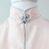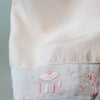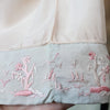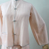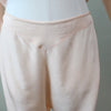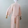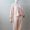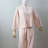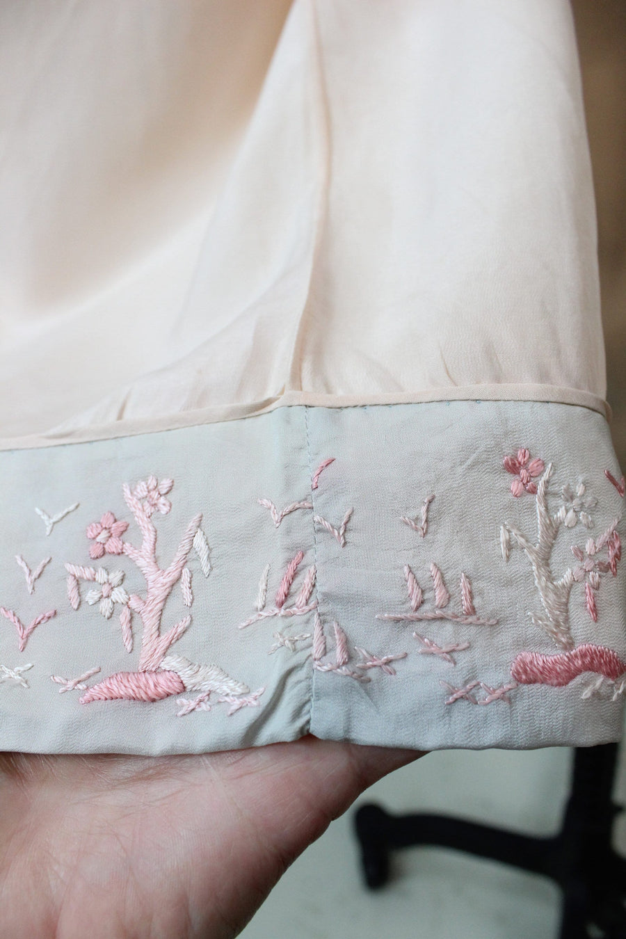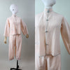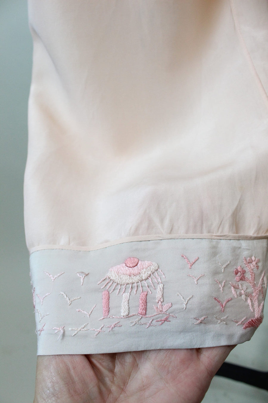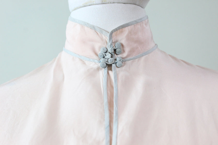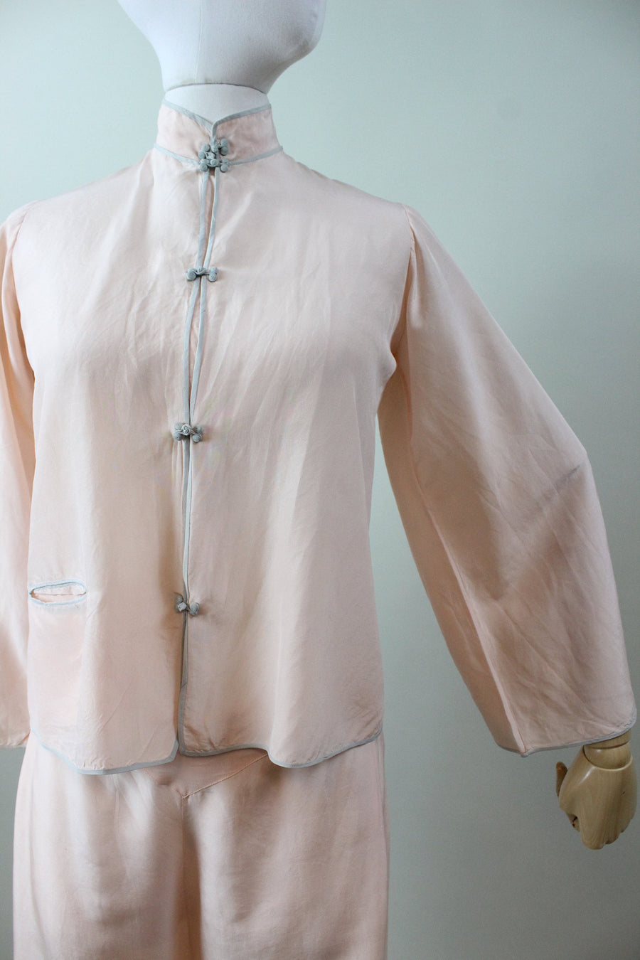 Covetable 1930's silk pajama set! Can be worn in a number of ways, as a true pajama/sleepwear set, as a top or as wide leg pants! Done in peachy pink silk with blue edges on the blouse and embroidered pink trim on the legs of the pants. Blouse has knotted frogs to close and pants have wide yoke and elastic back. Wide kimono sleeves. Both are unlined.
