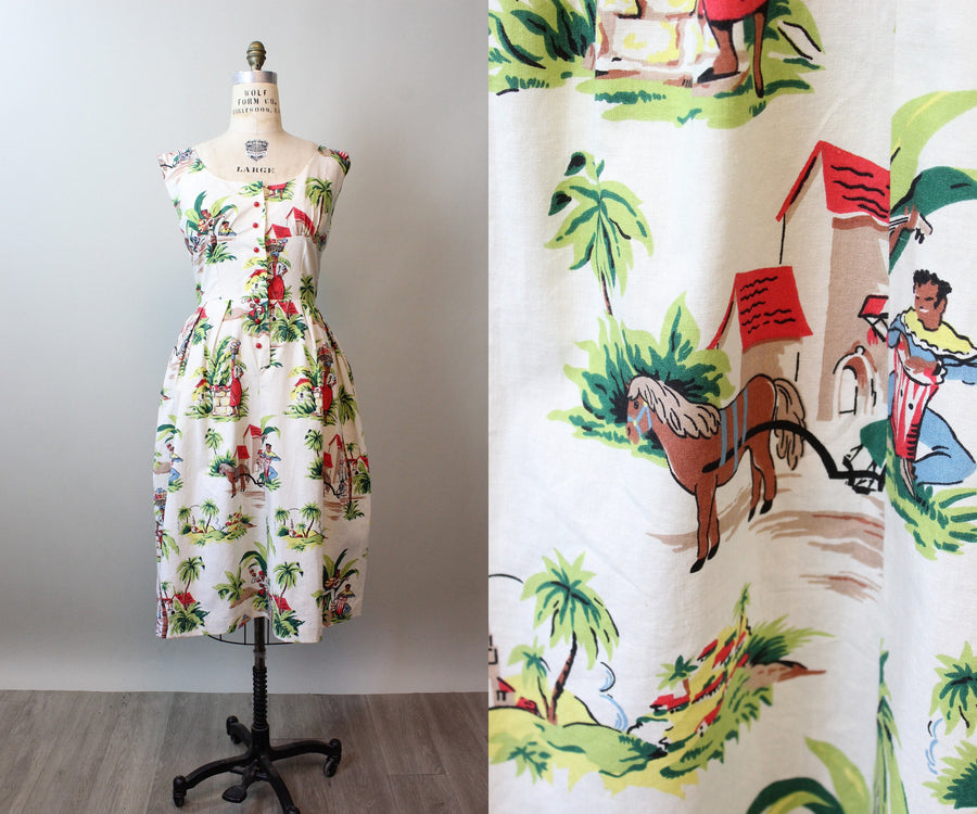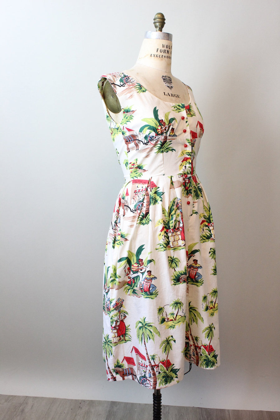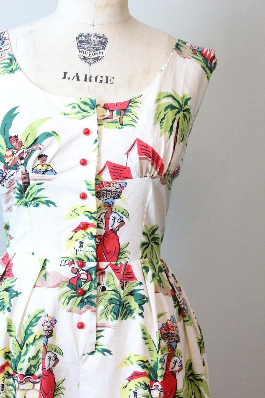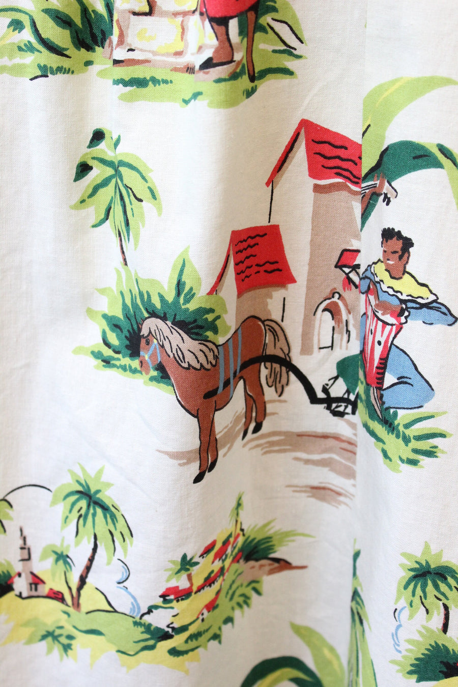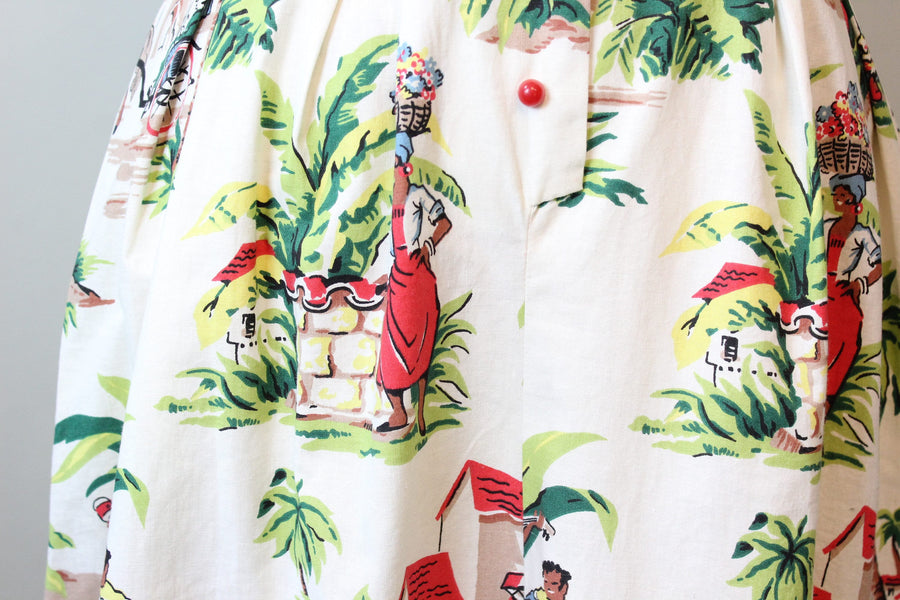 Darling 1950's novelty print dress! Done in a crisp cotton printed with tropical scenes of women with baskets on their heads, palm trees, and musical instruments. Decorative buttons, curved bustline and fitted waist. Full skirt and low back. Back metal zip. Unlined.