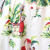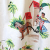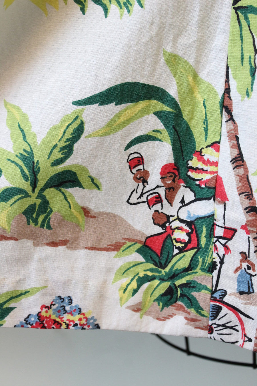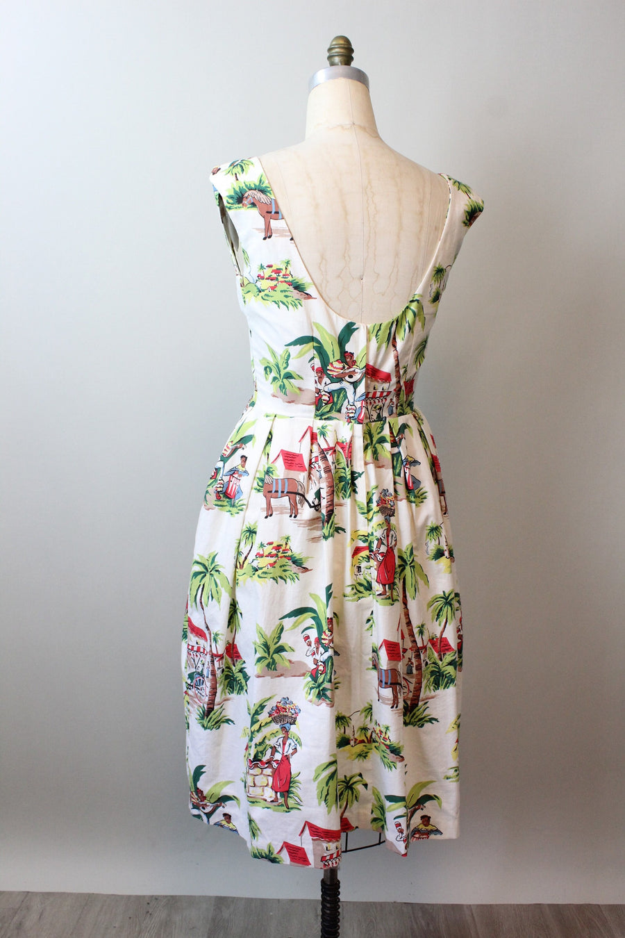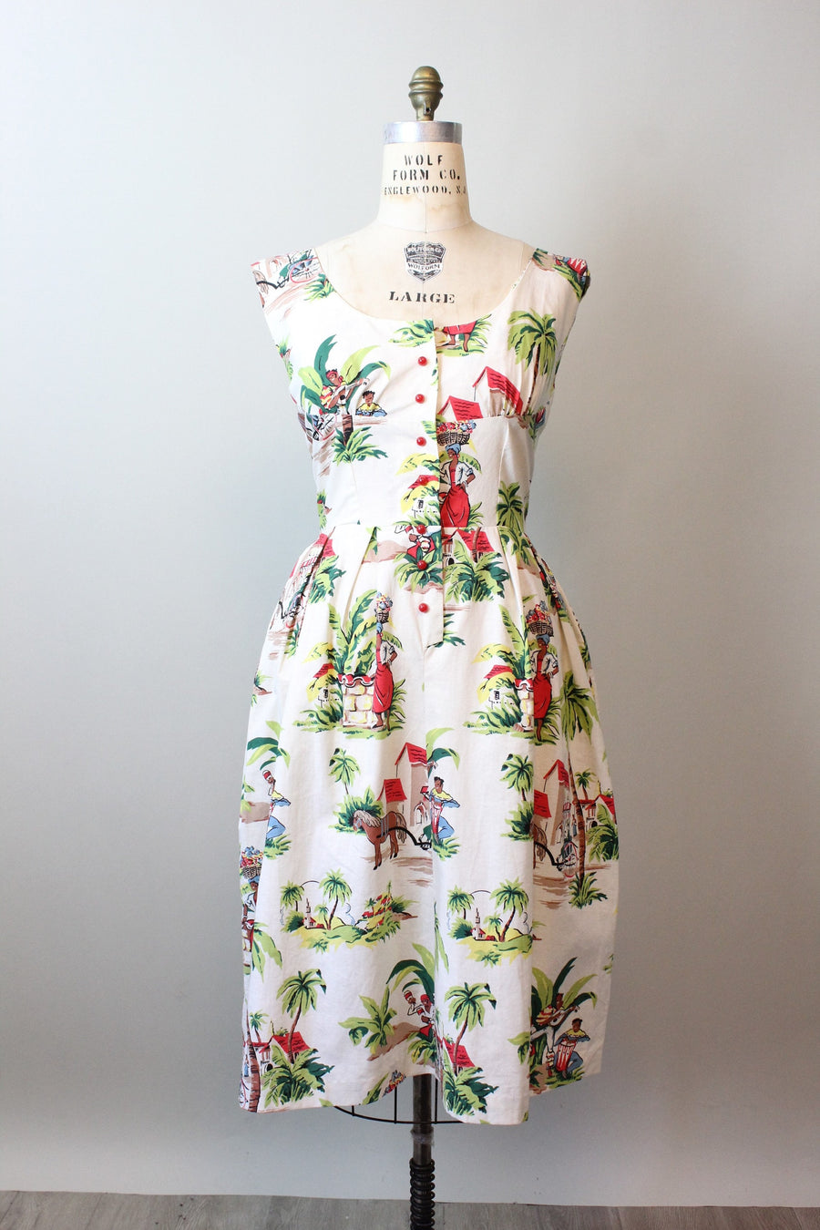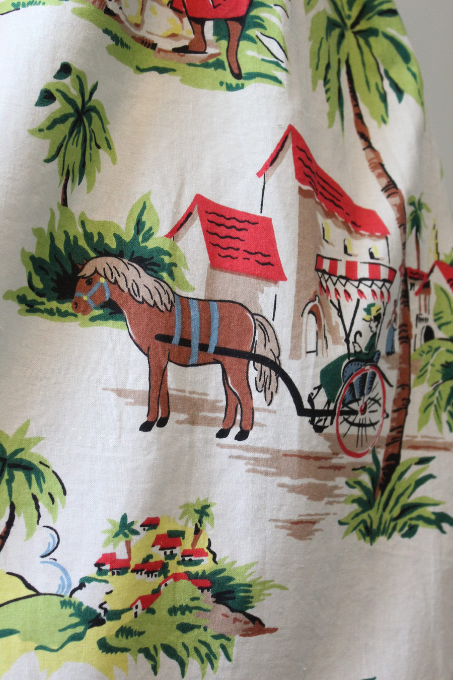 Darling 1950's novelty print dress! Done in a crisp cotton printed with tropical scenes of women with baskets on their heads, palm trees, and musical instruments. Decorative buttons, curved bustline and fitted waist. Full skirt and low back. Back metal zip. Unlined.