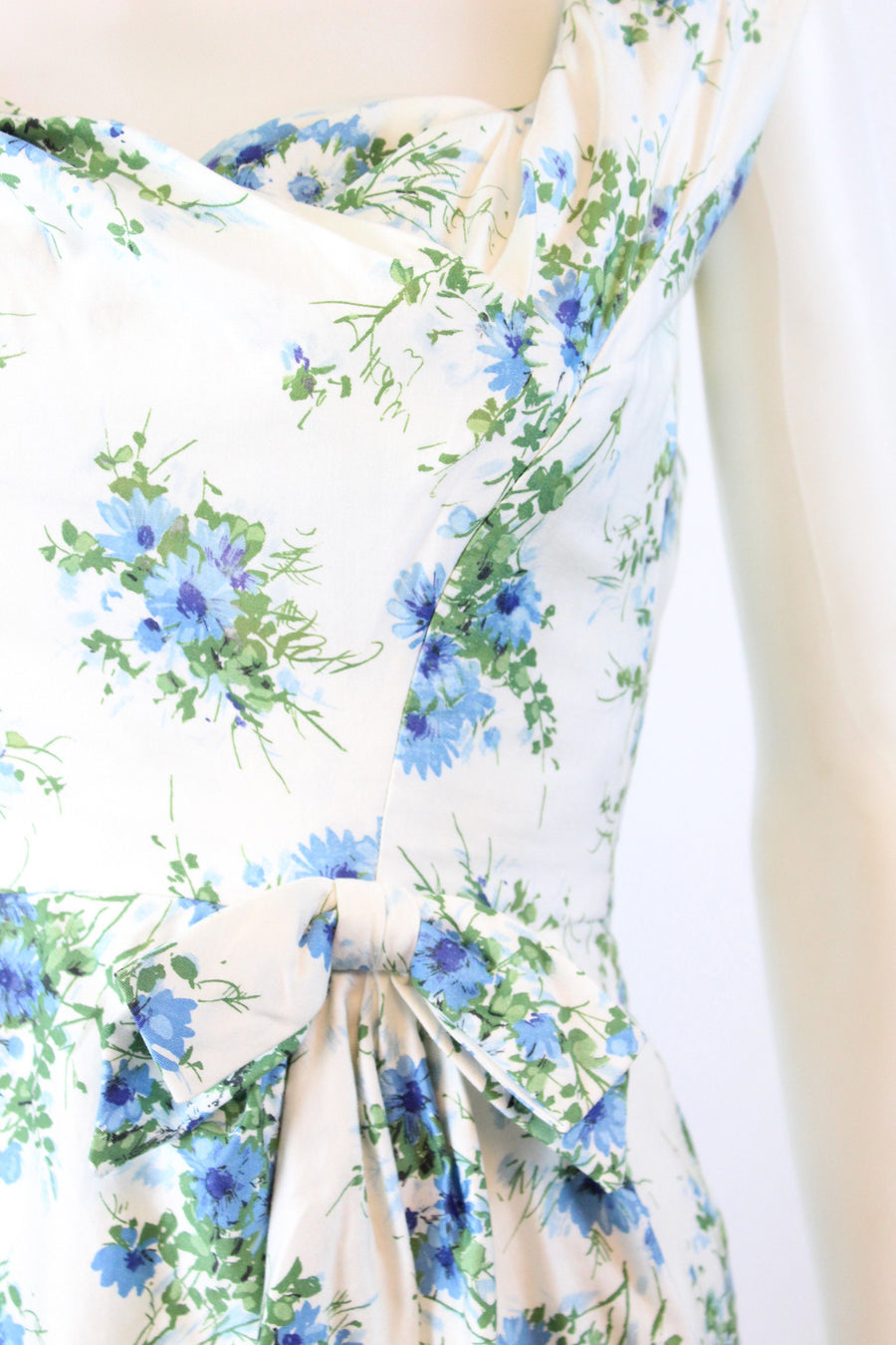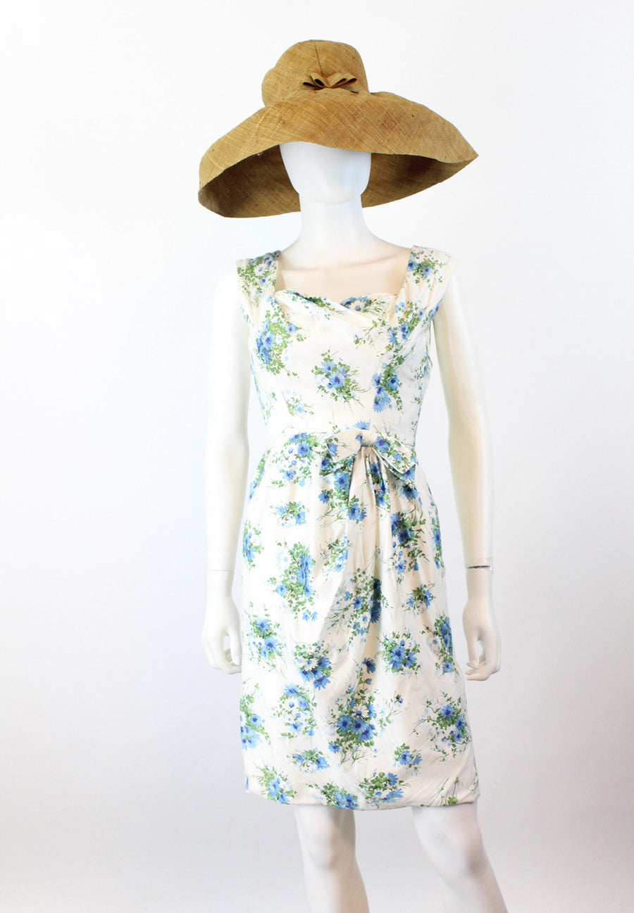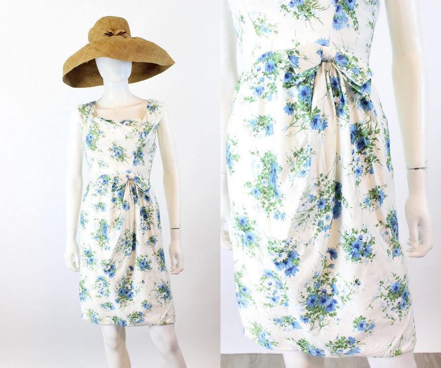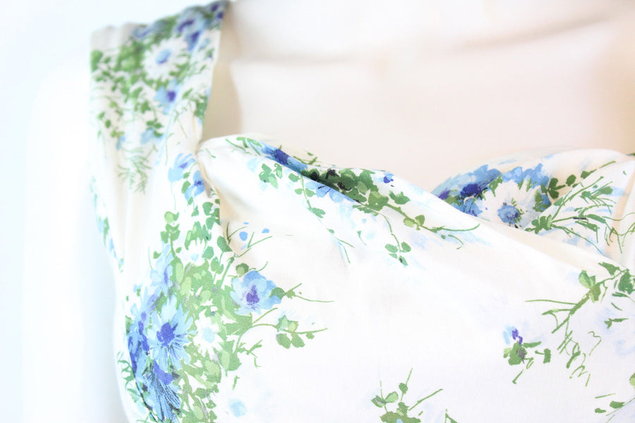 Lovely little 1950's dress done in a crisp white cotton with a blue and green floral print. Crossover bodice, fitted waist and slim skirt. Bow at the waistline. Back metal zip. Fabric is lined in a sheer silk organza for structure, and the bodice has an extra white cotton lining.