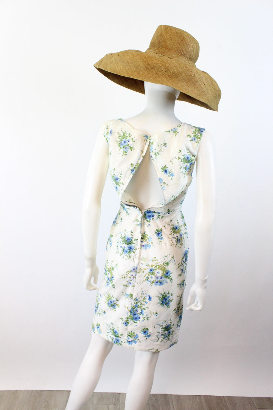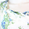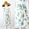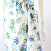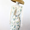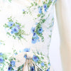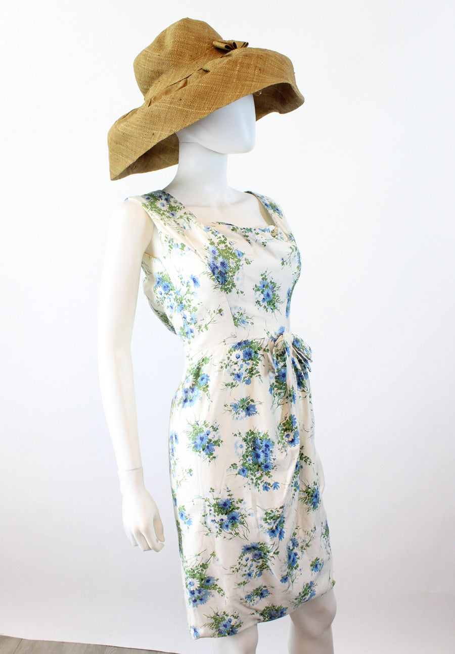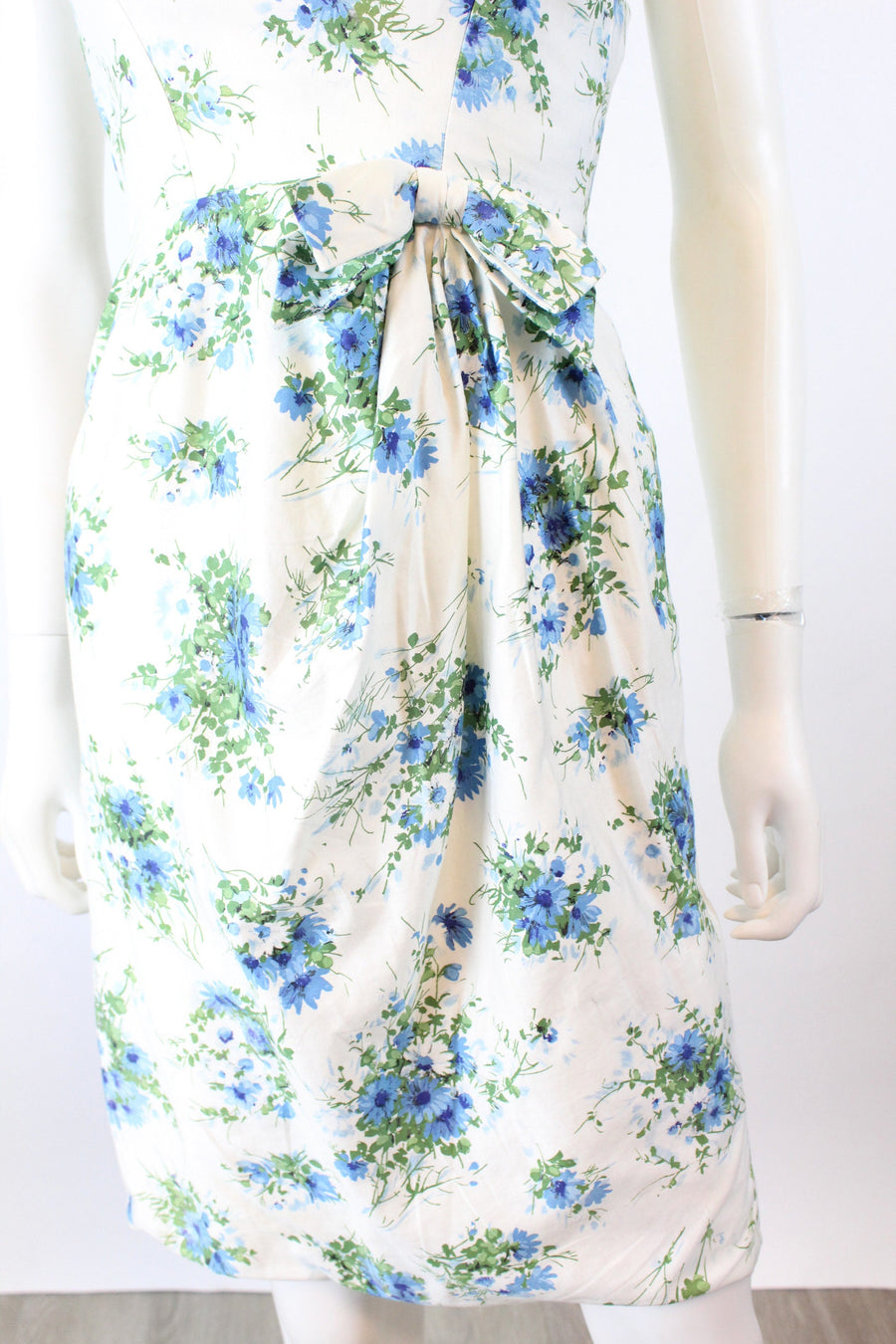 Lovely little 1950's dress done in a crisp white cotton with a blue and green floral print. Crossover bodice, fitted waist and slim skirt. Bow at the waistline. Back metal zip. Fabric is lined in a sheer silk organza for structure, and the bodice has an extra white cotton lining.