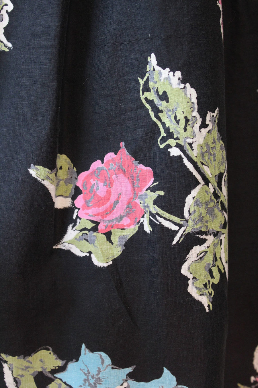 Spectacular 1950's skirt! done in a blue and pink rose print cotton. 2" wide waistband with double buttons and metal zipper on the side. Unlined.