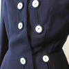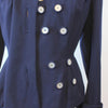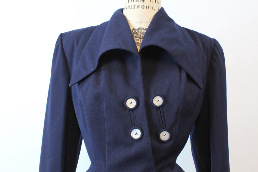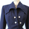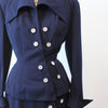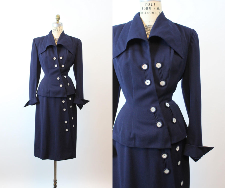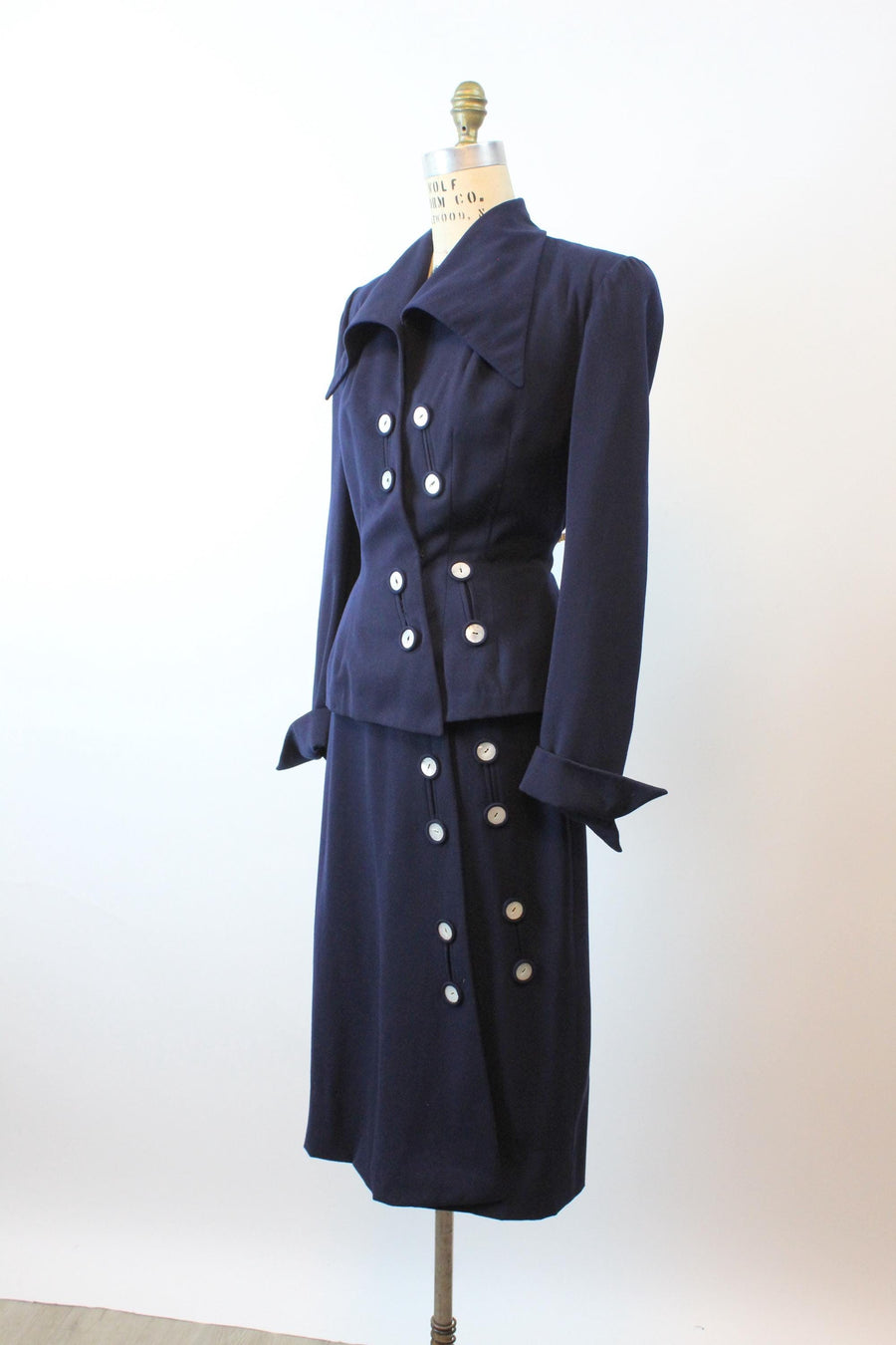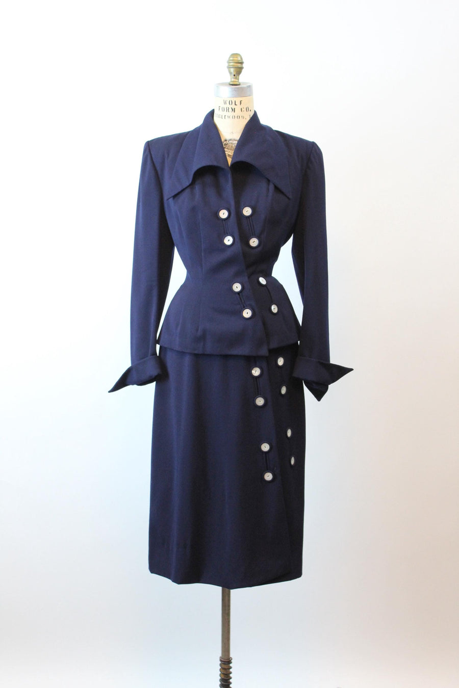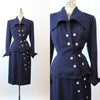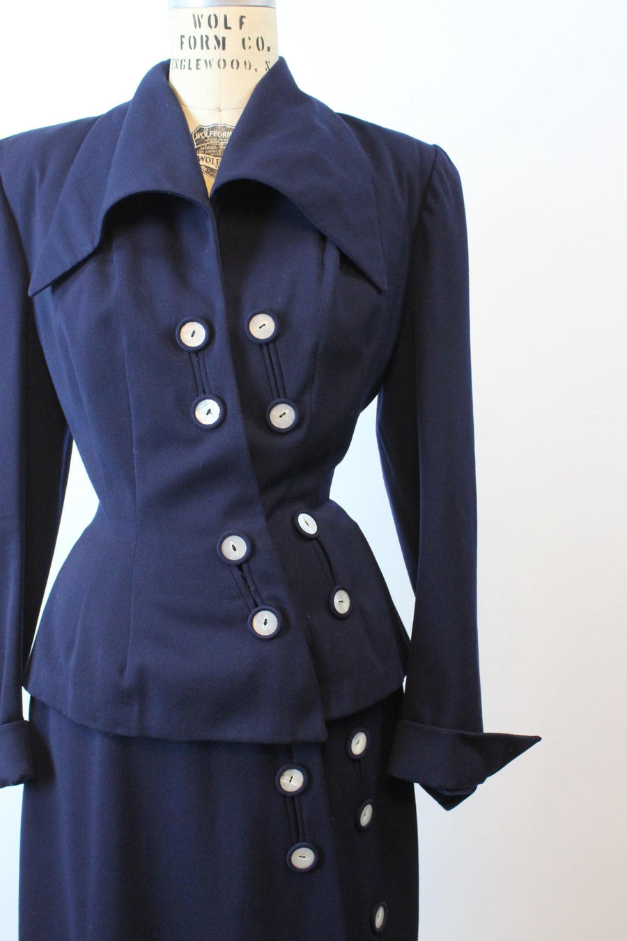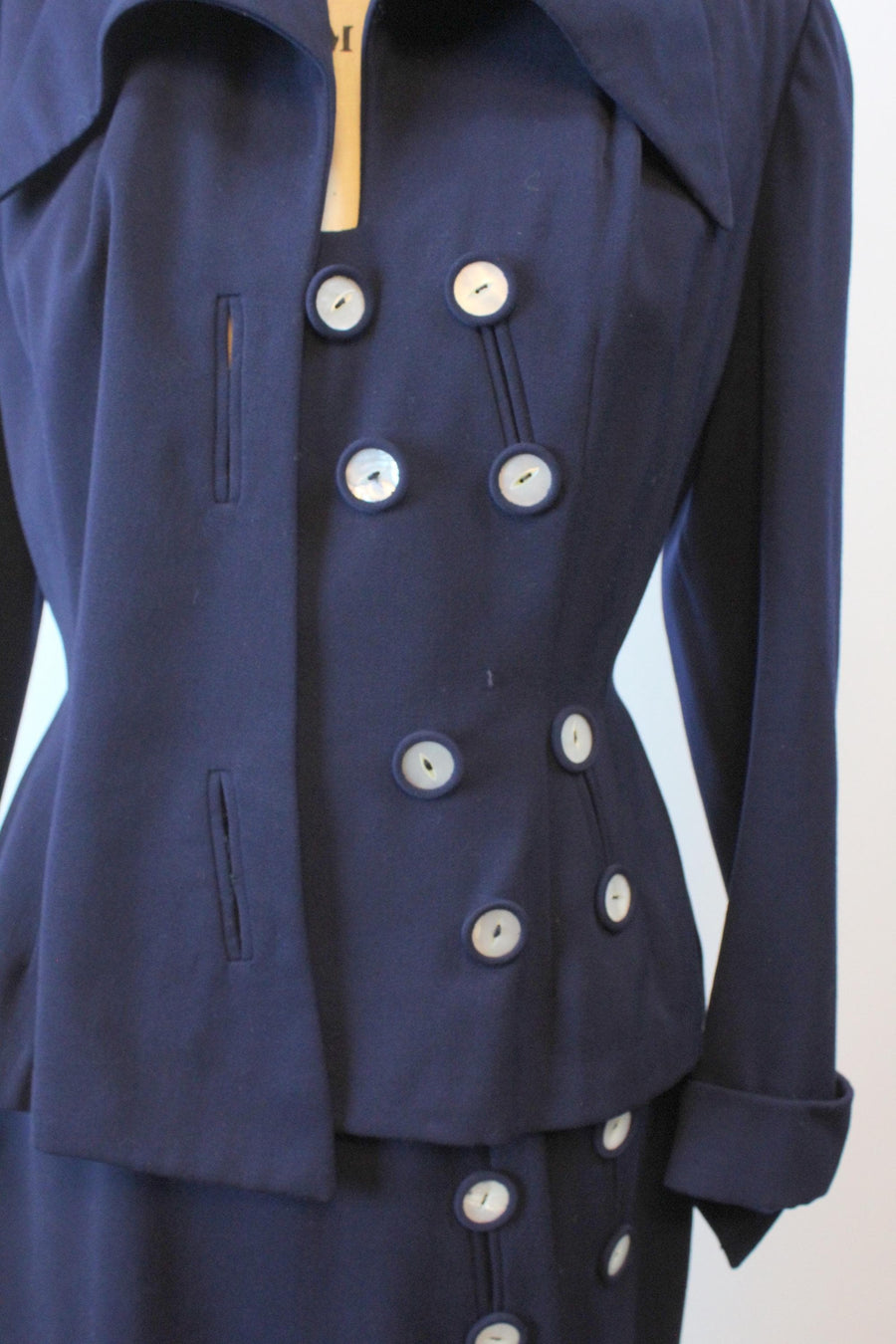 Coveted and collectible documented 1951 Lilli Ann suit! Done in navy wool gabardine with abalone buttons that are edged in the navy wool. A true fit and flare shape on the jacket and the skirt is slim with a unique panel that looks like a wrap style. Ultra wide collar is tacked down to make an undulating effect. Double buttons angled on the jacket match up perfectly with the ones on the skirt! Wide shoulders, cuffs and nipped in waist. The buttons are decorative on the skirt and it has a button and side metal zipper. Skirt is partially lined, jacket is fully lined in navy crepe.