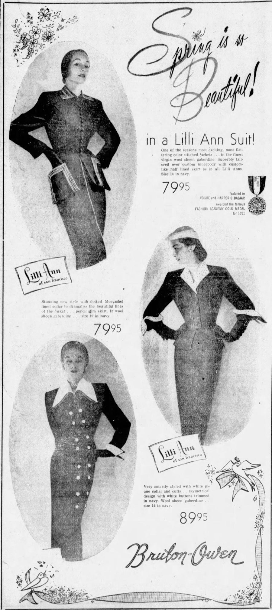 The ad reads: Two rows of buttons are better than one to dramatize the new narrowing silhouette...to point up the smartness of the new uneven hemline, to focus attention on elegant tailoring in finest worsted wool sheen gabardine, this is one of a series of exciting new Lilli Ann suits designed for spring and ready now with all the marvelous Lilli Ann characteristics, custom inner body, half lined skirt, couturier details...in navy , black and wonderful spring colors about $100" ($1440 in todays money)