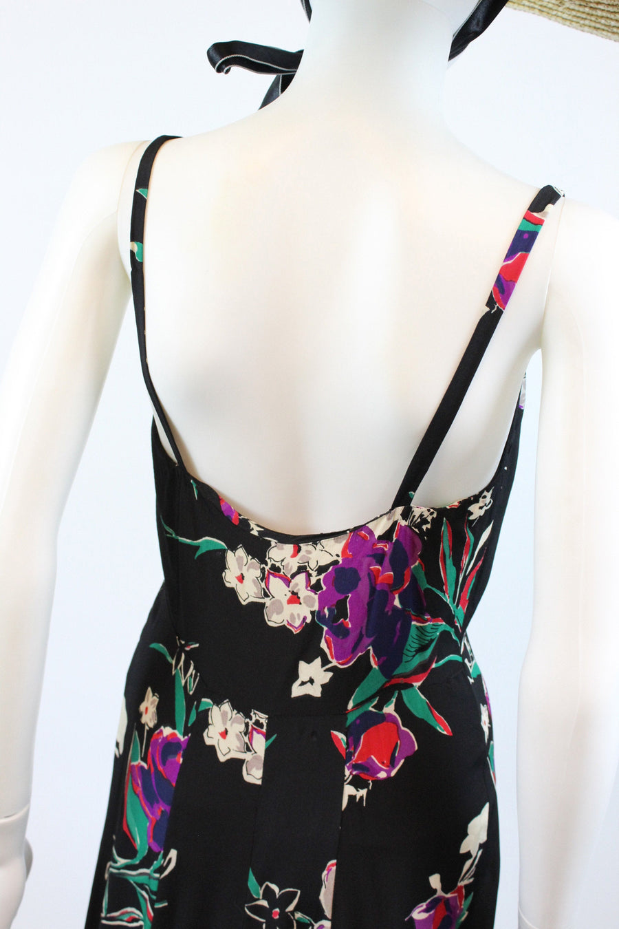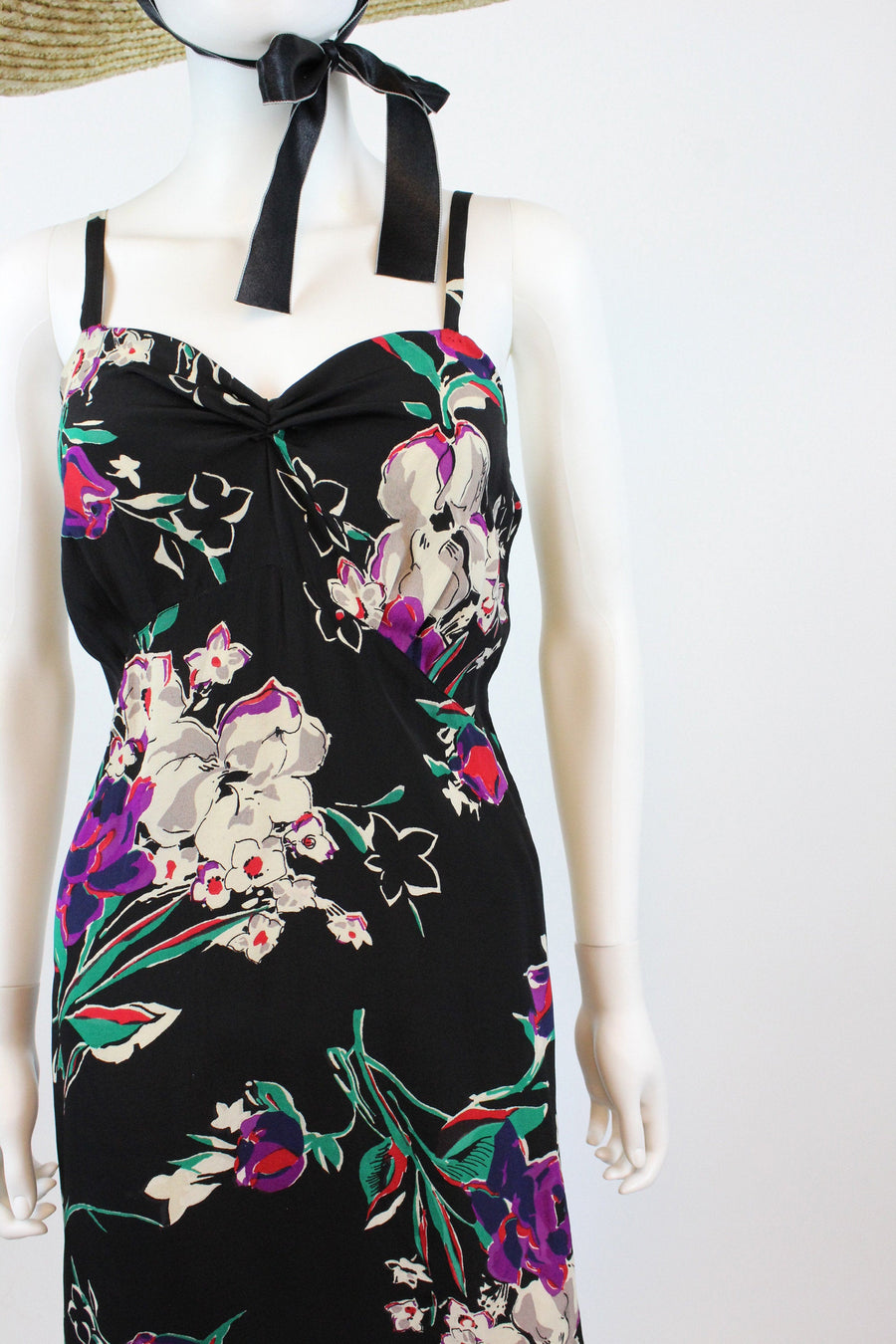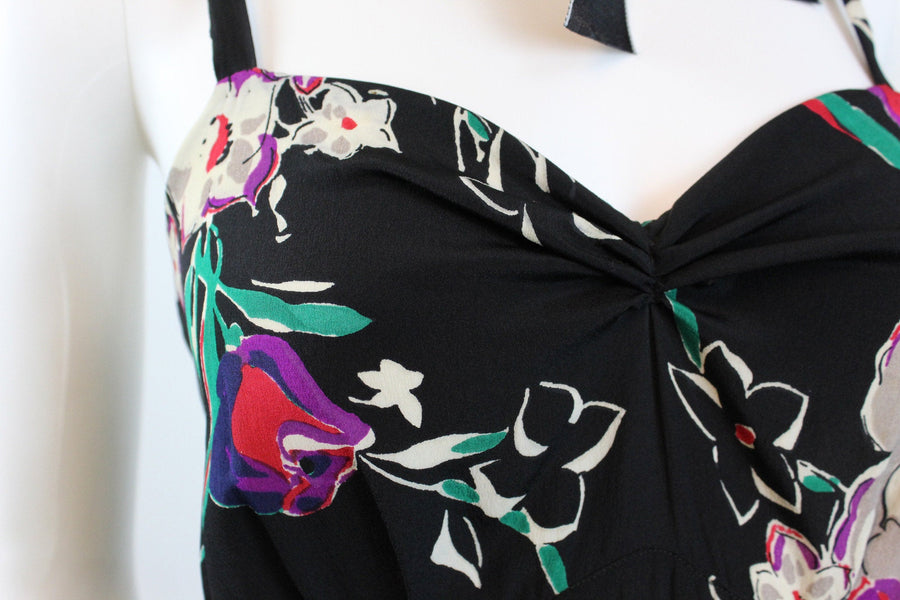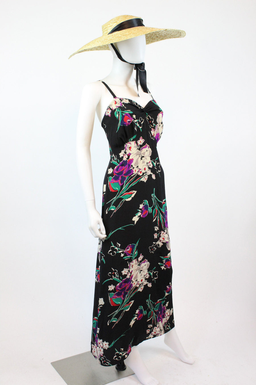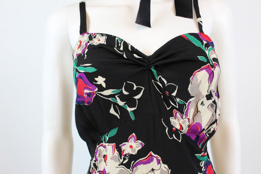 Exquisite 1930's dress! Done in a super lightweight rayon with flowers. Gathered bustline, long straps, curved underbust seam and long bias cut skirt. Side snaps. Unlined.