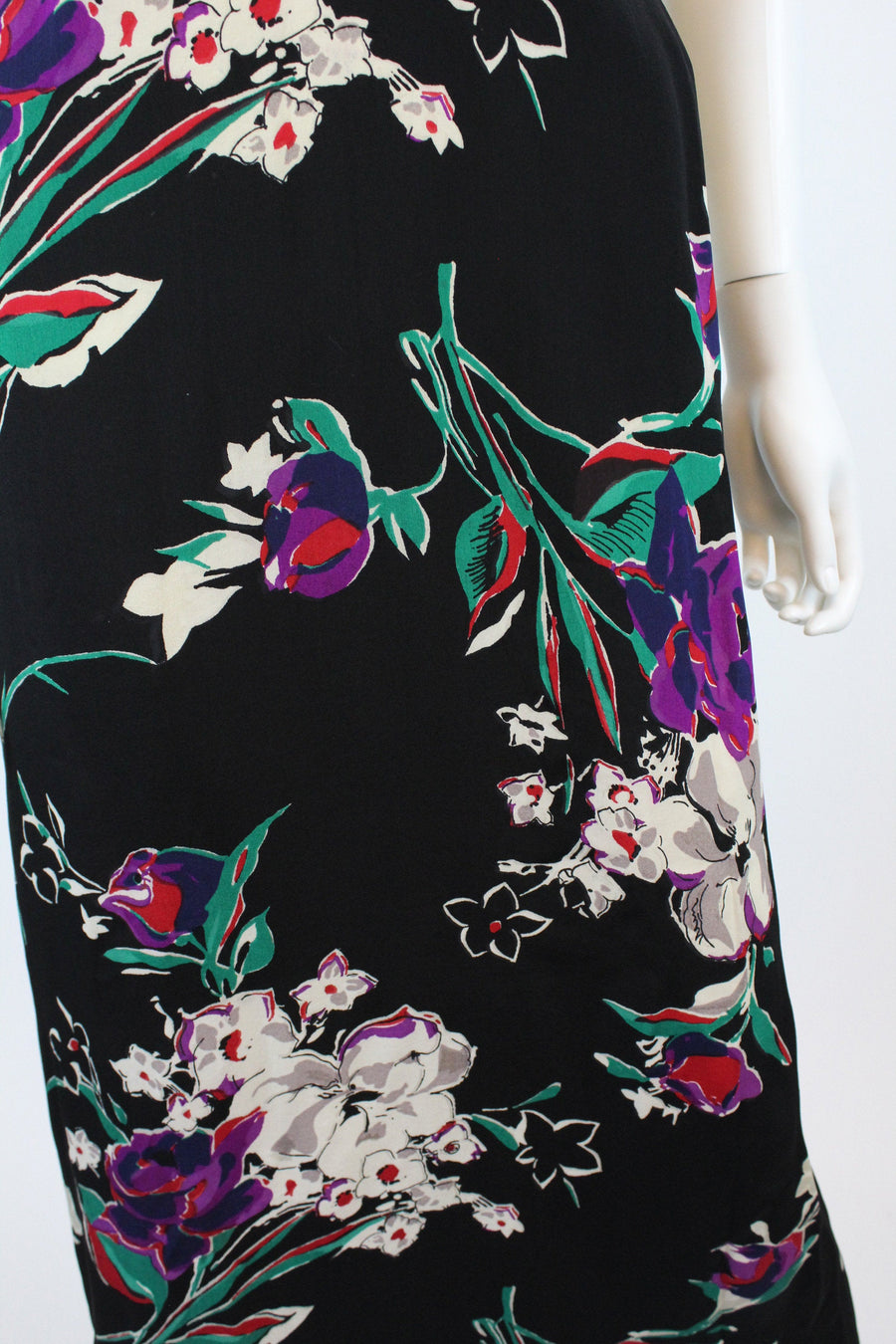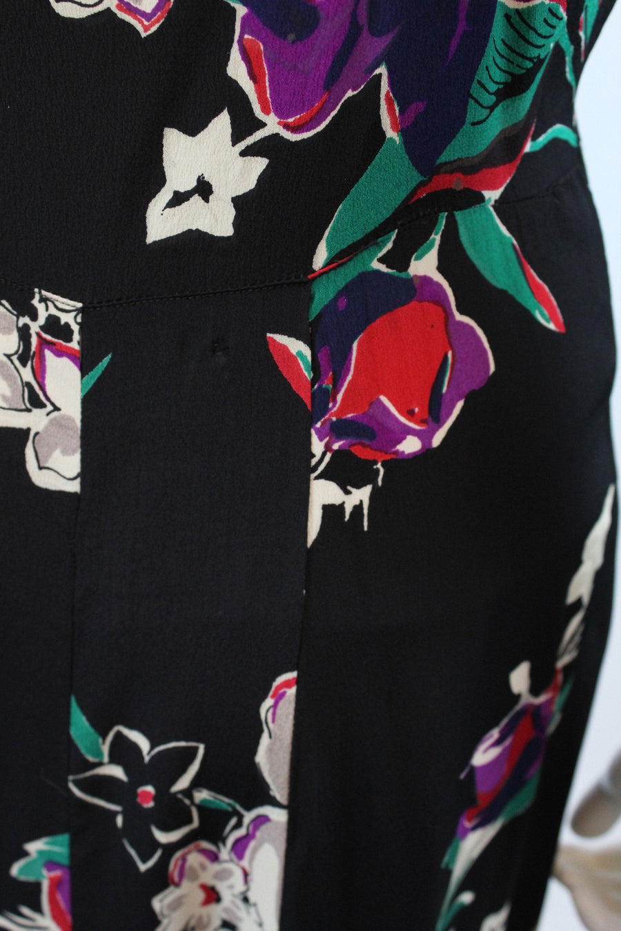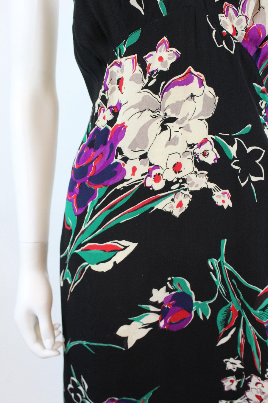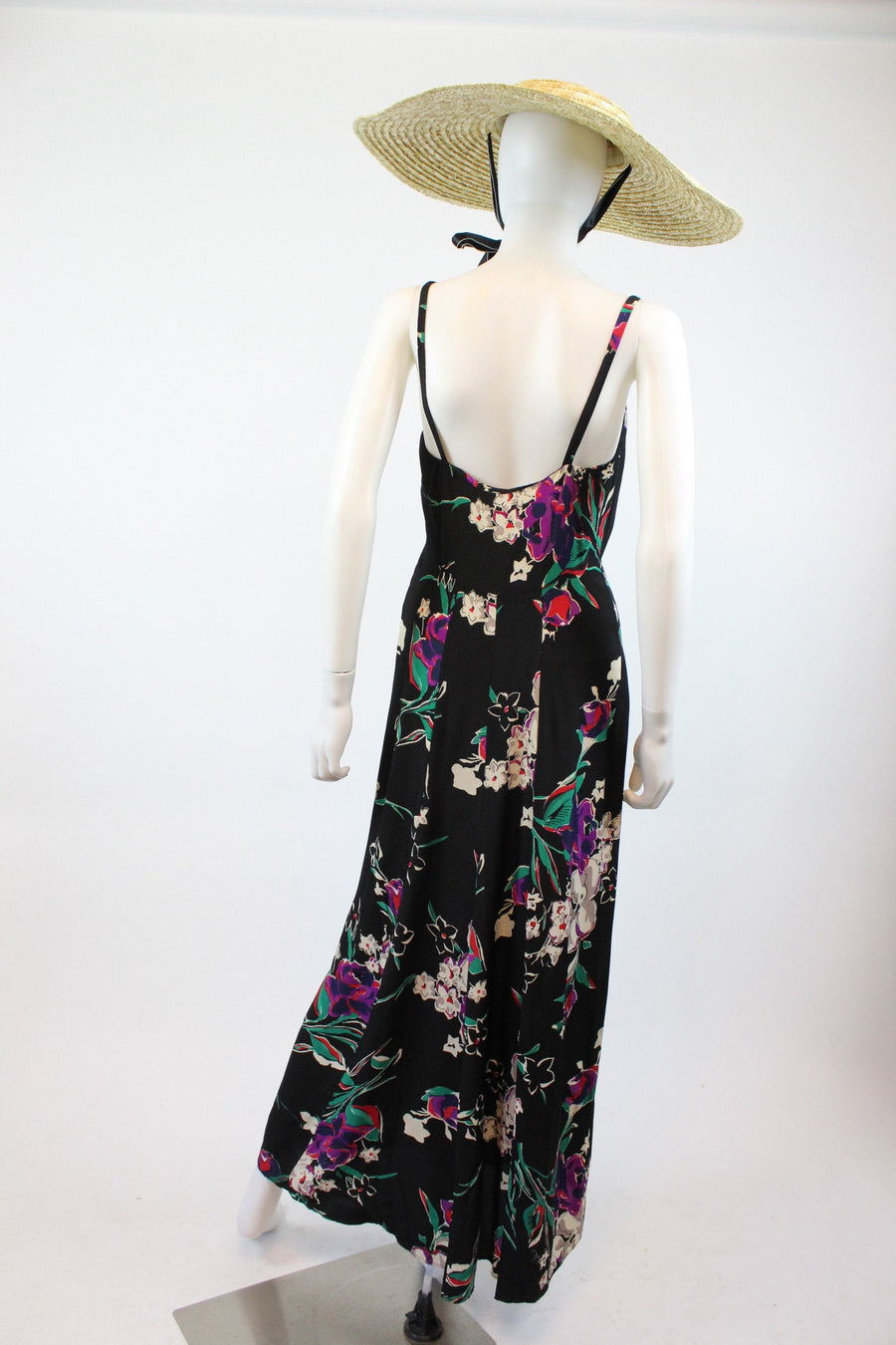 Exquisite 1930's dress! Done in a super lightweight rayon with flowers. Gathered bustline, long straps, curved underbust seam and long bias cut skirt. Side snaps. Unlined.
