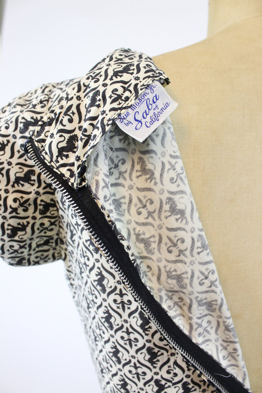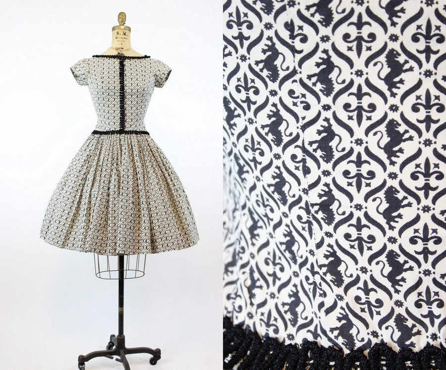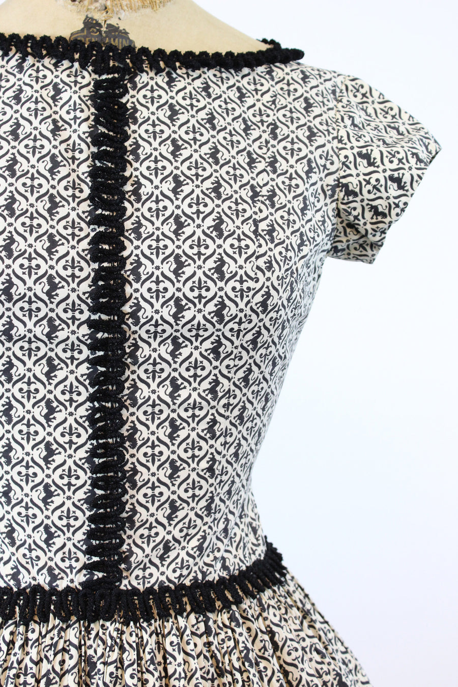 Charming 1950's cotton dress! Crisp white cotton printed with heraldic figures such as lions and fleur de lys. Twisted and looped black trim along the round neckline, down the front and on the drop waistline. Gathered ultra full skirt. Back metal zip. Unlined.