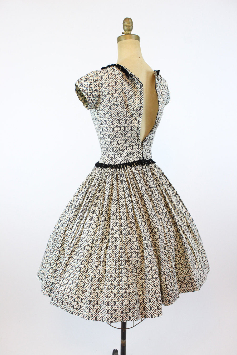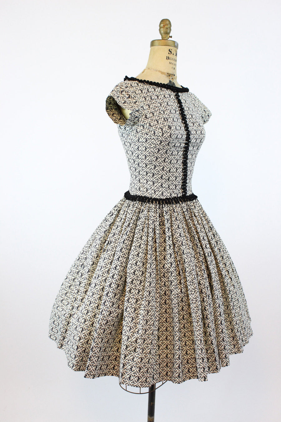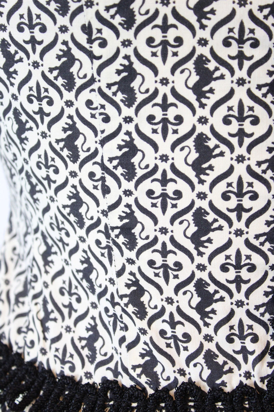 Charming 1950's cotton dress! Crisp white cotton printed with heraldic figures such as lions and fleur de lys. Twisted and looped black trim along the round neckline, down the front and on the drop waistline. Gathered ultra full skirt. Back metal zip. Unlined.