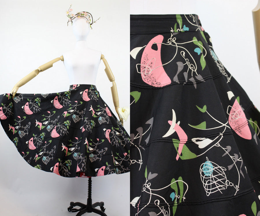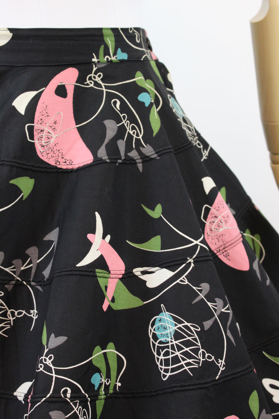 The perfect 1950's mid century circle skirt! Done in black cotton with a spectacular atomic boomerang print, the atomic print is done in pink, blue and green. There are five rows of double piping running down the skirt, ultra full skirt. Side metal zip and button, unlined.
